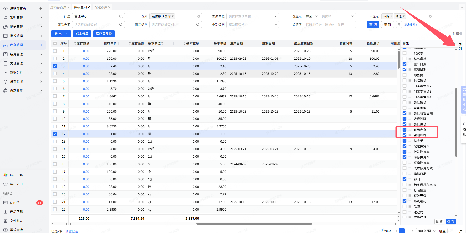 若没有可用库存、占用库存列,需要到列定制里勾选上。