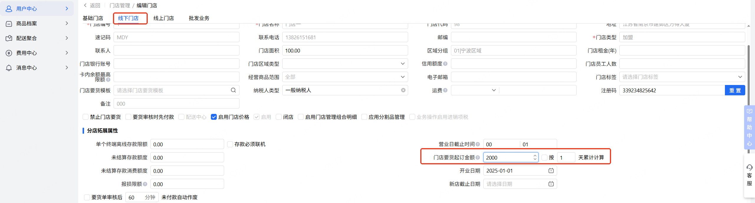 👉【操作路径】:档案-用户中心-门店管理,门店要货起订金额