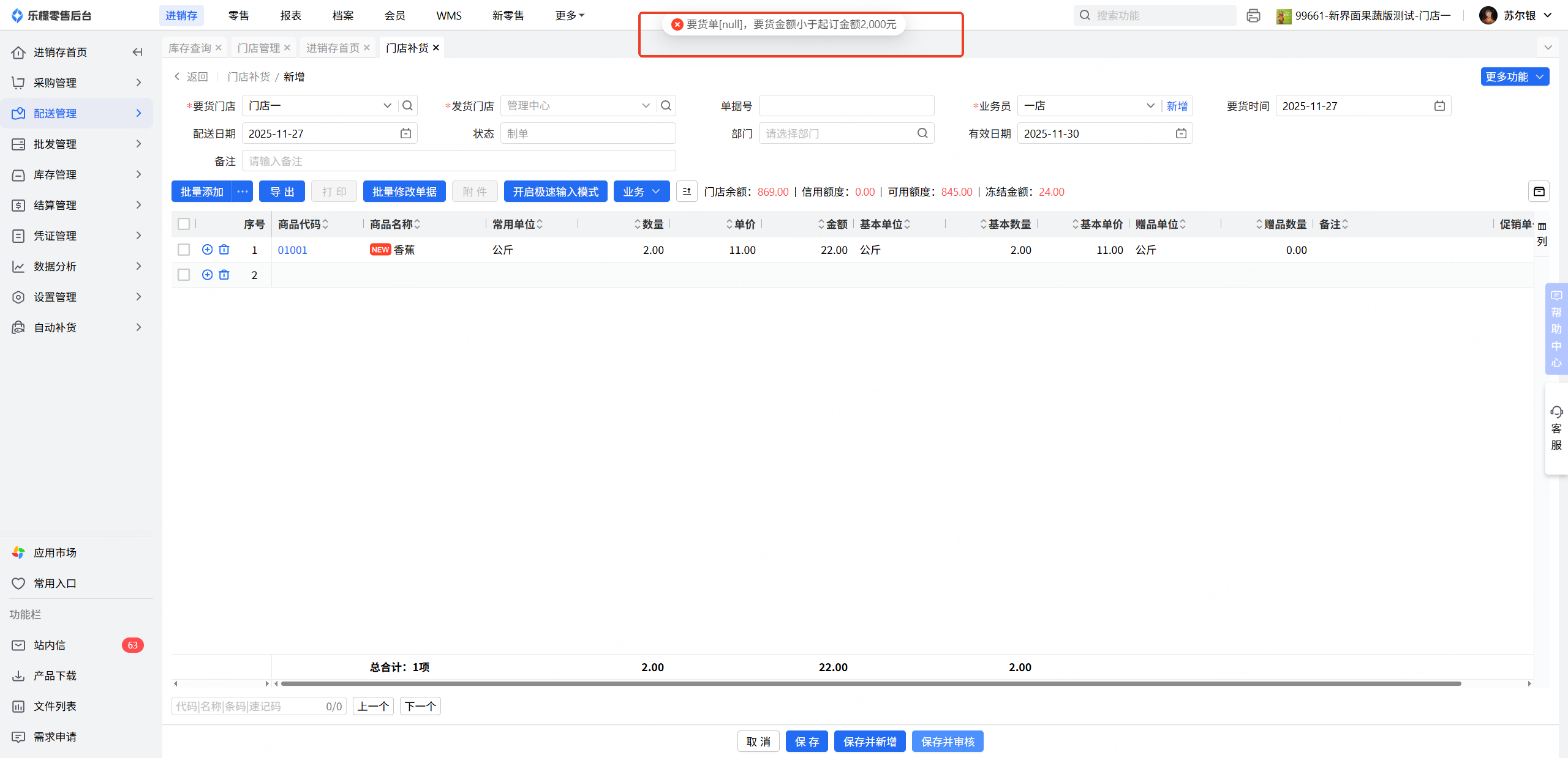 当此门店要货金额不足2000时,提示:要货单【xx】,要货金额小于起订金额xx元。