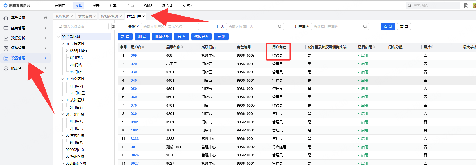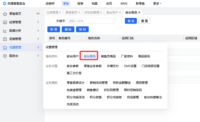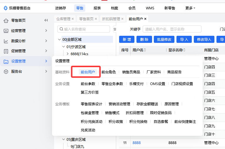 👉【操作路径】:1.零售-设置管理-前台用户,前台角色