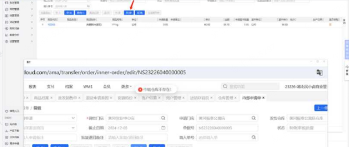 内部申请单同意提示中转仓不存在