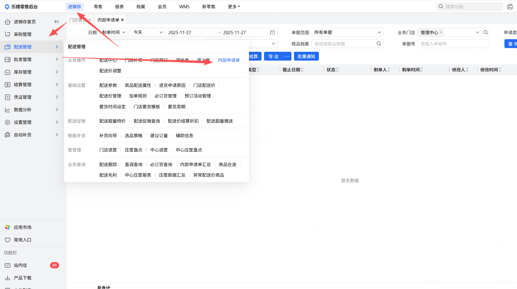 👉【操作路径】:进销存-配送管理-内部申请单