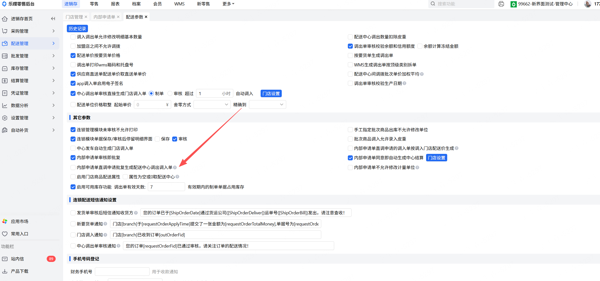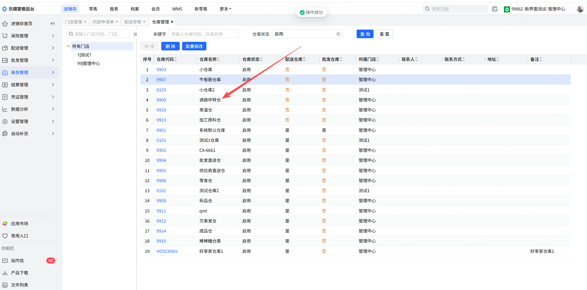ps:该功能需要配送中心门店新增仓库,且仓库名称内包含“调拨中转仓”