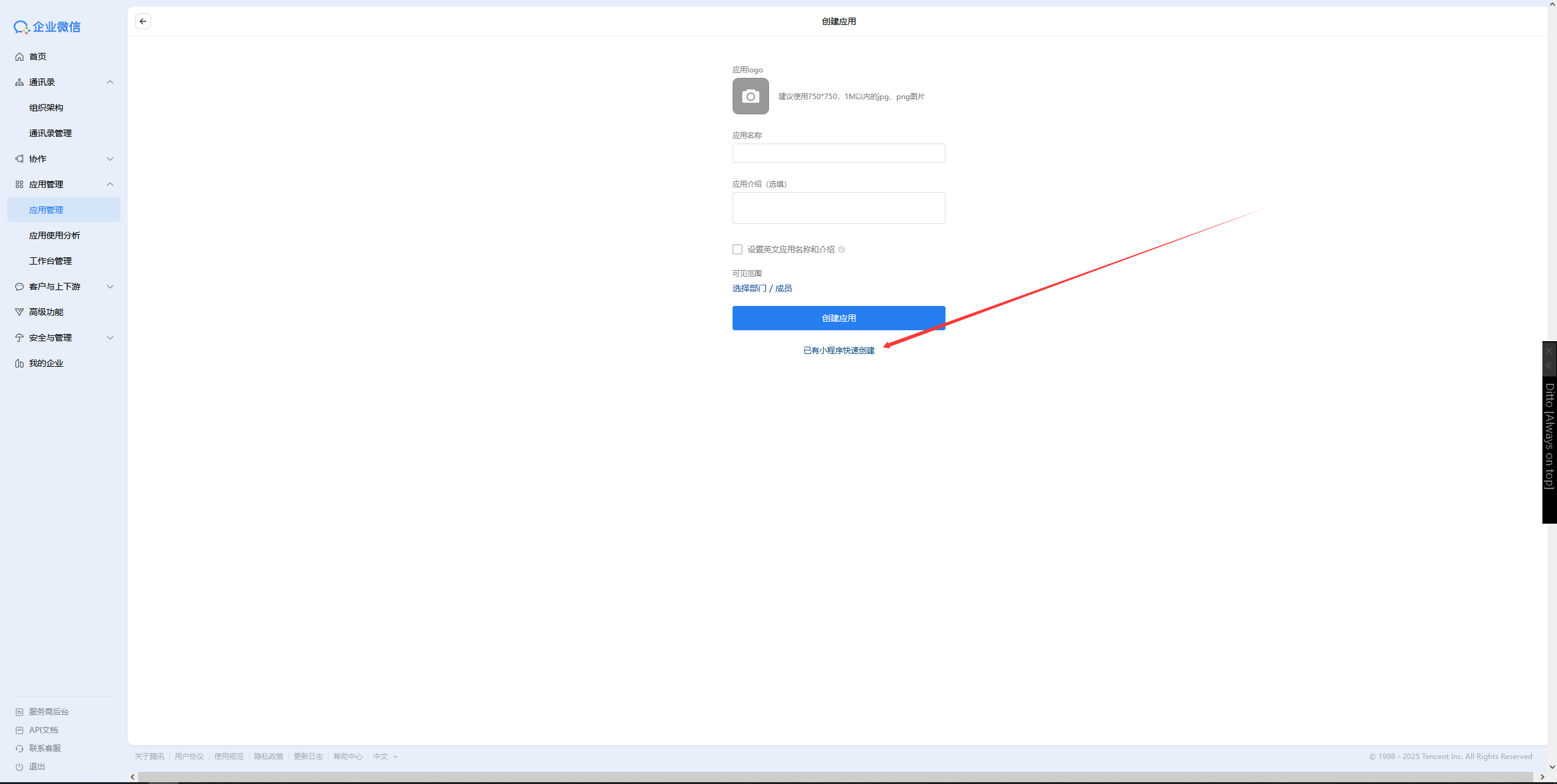 登陆企业微信后台,在应用管理底部自建一栏点击“创建应用”,再点击“已有小程序快速创建”,最后使用小程序管理员的微信进行扫码授权绑定即可