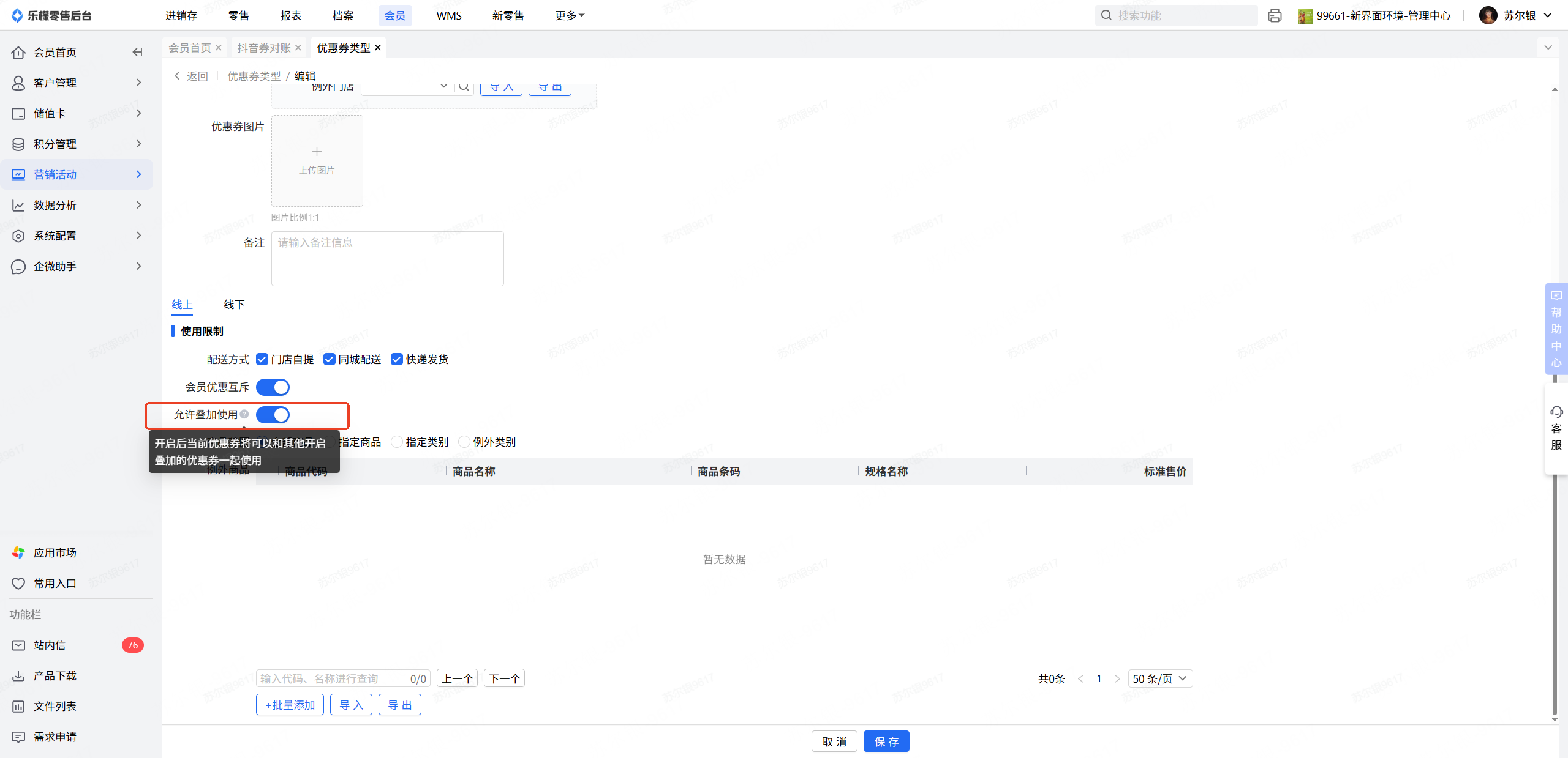 👉【操作路径】:全渠道会员V2-营销活动-优惠券类型,对应优惠券类型编辑界面,线上规则里开启允许叠加使用开关