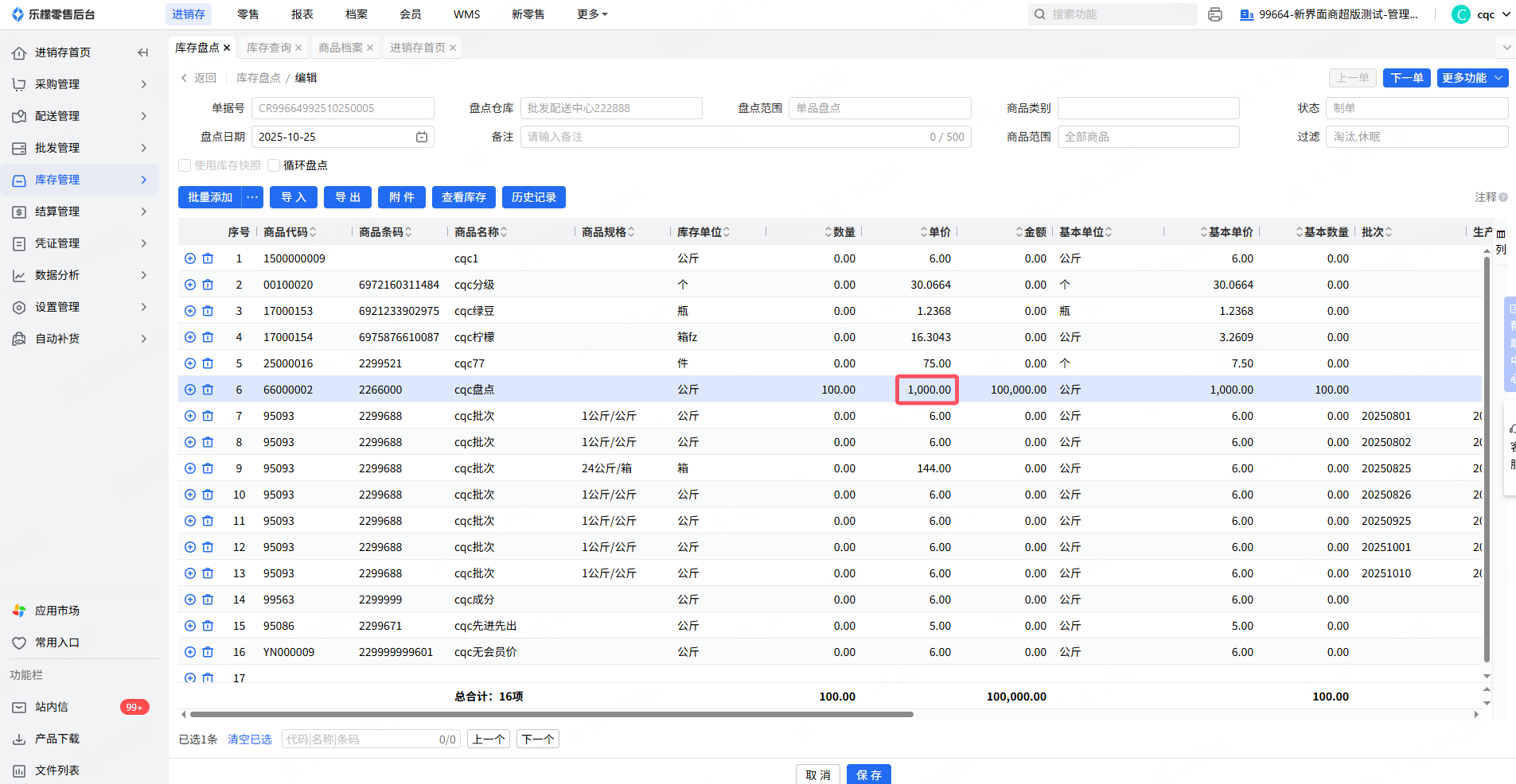 例如商品:cqc盘点,盘点单里显示该商品单价1000/个
