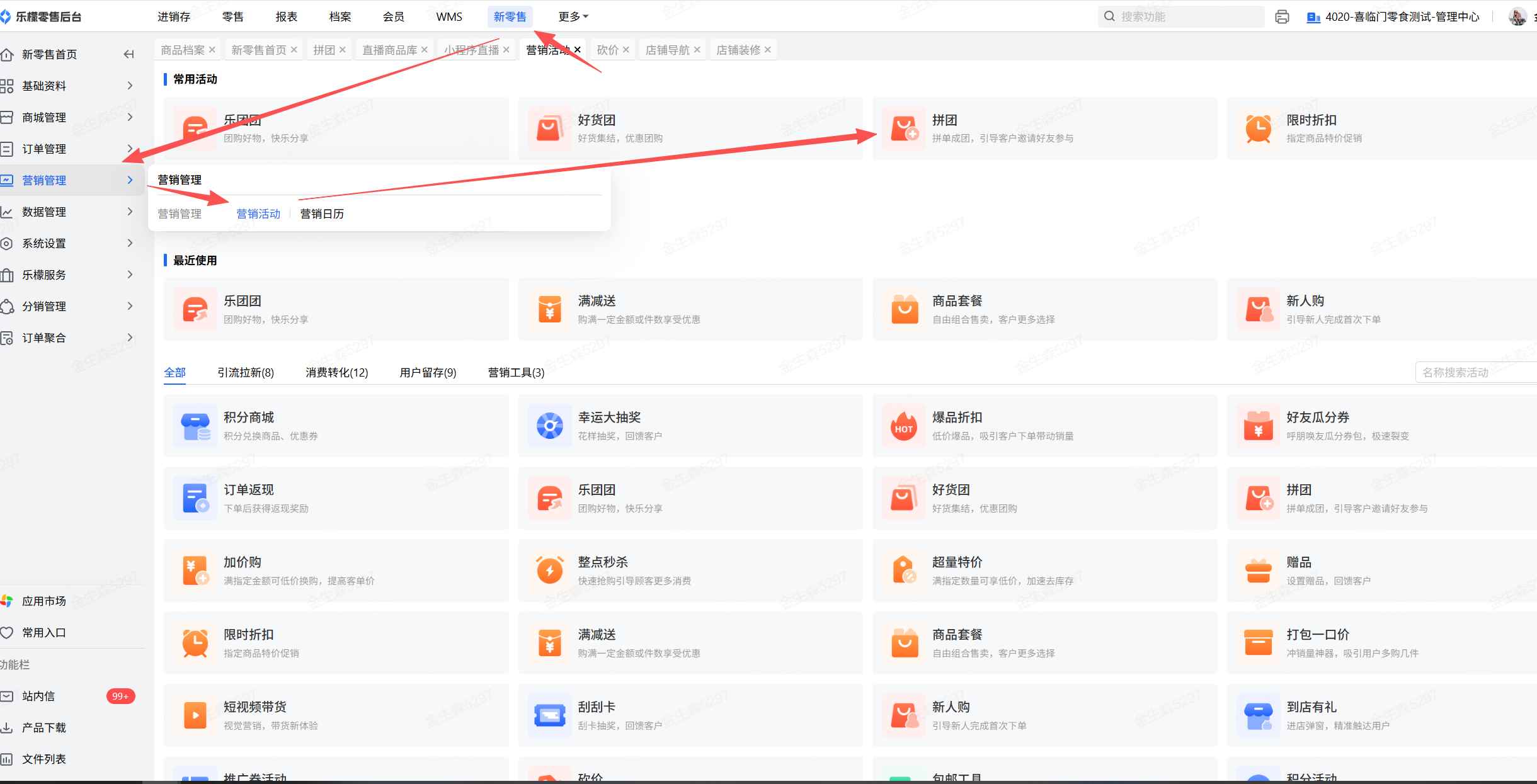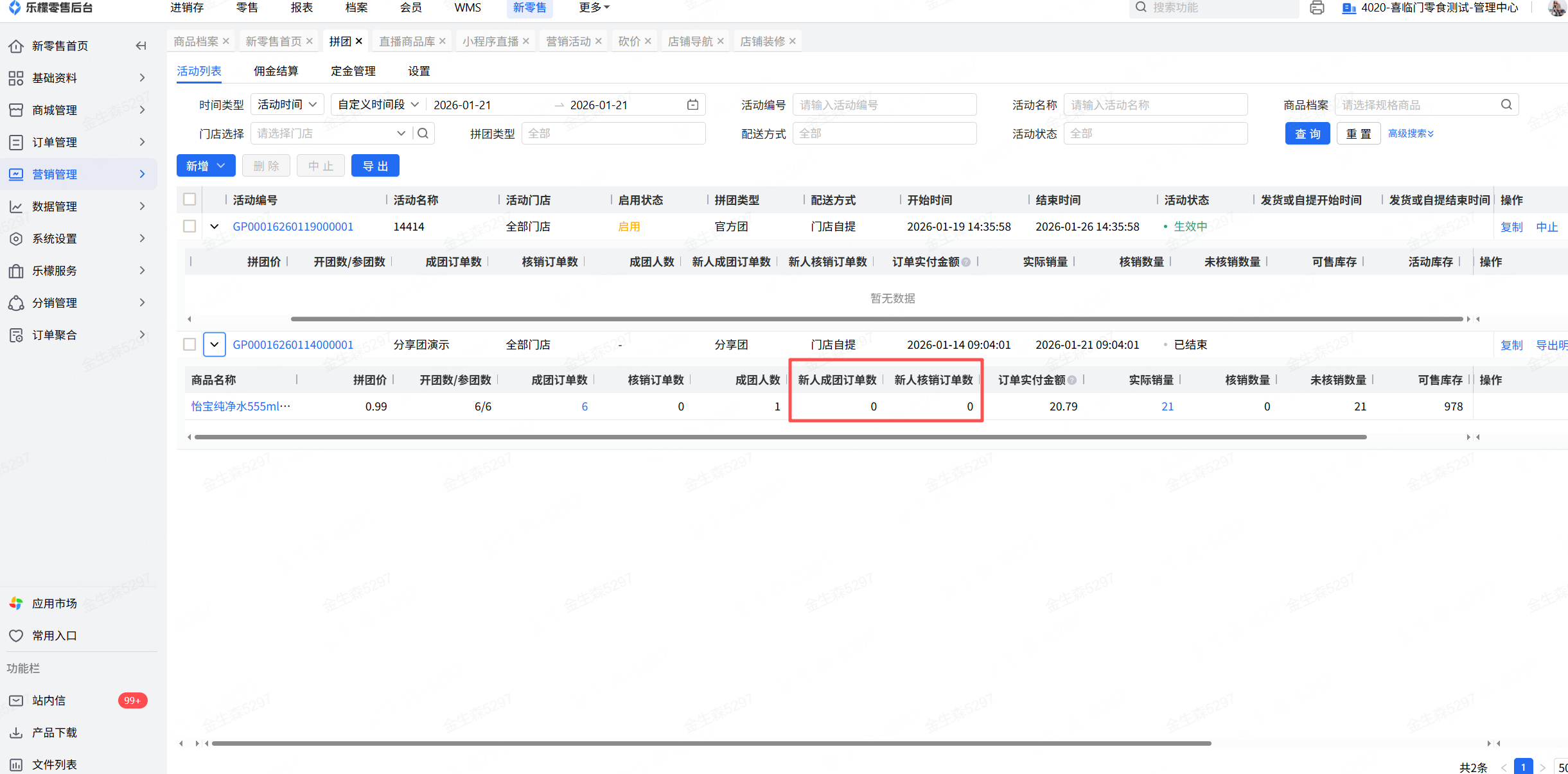 乐檬新零售-营销管理-营销活动-拼团,在拼团活动列表里找到需要查看的拼团活动,点击活动编号左边的“小箭头”可以向下展开查看活动商品的拼团数据,包含新人成团订单数和新人核销订单数