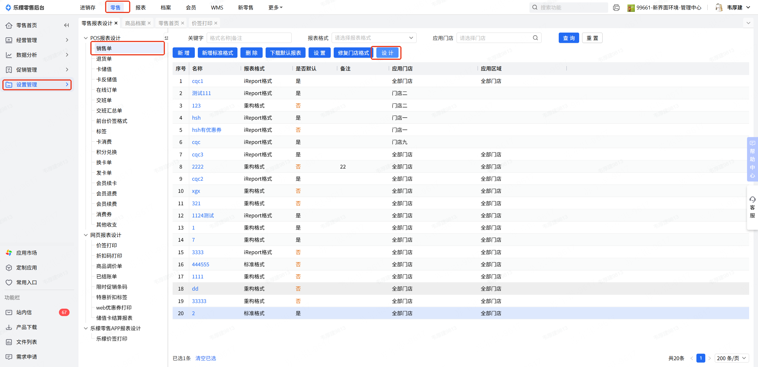👉【操作路径】:1.零售-设置管理-零售报表设计-销售单