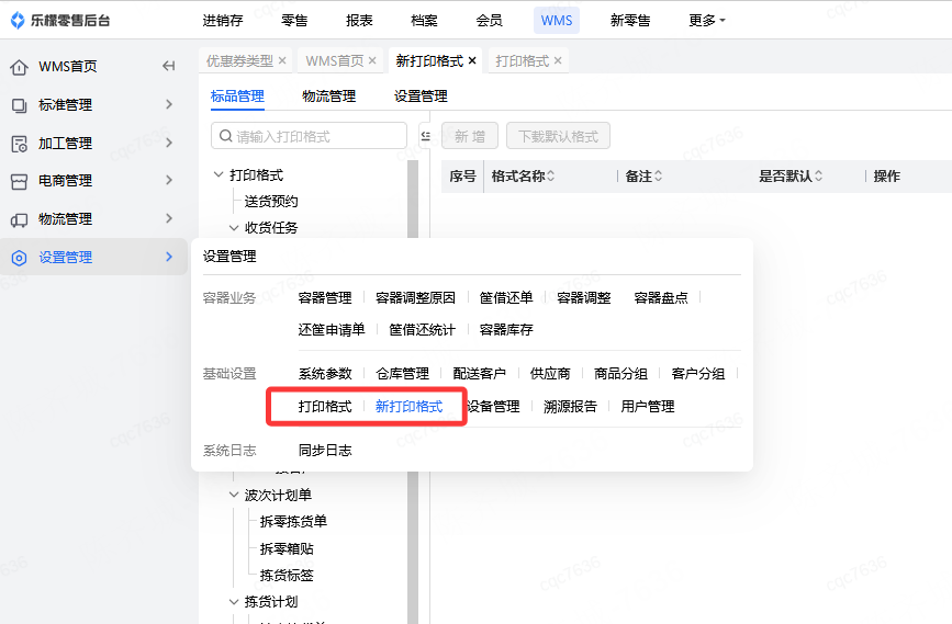 👉【操作路径】:1.WMS-设置管理-基础设置-新打印格式