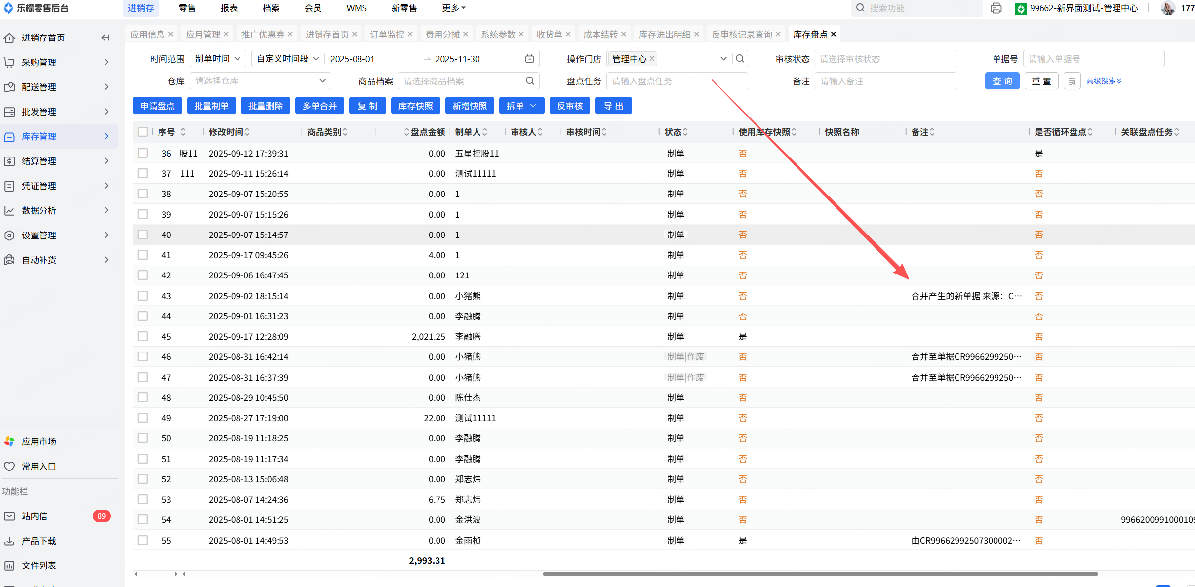 勾选2张及以上的盘点单据,原单作废合并生成新的单据,商品累加,且合并后盘点范围=单品盘点,备注:合并产生的新单据 来源:xx
