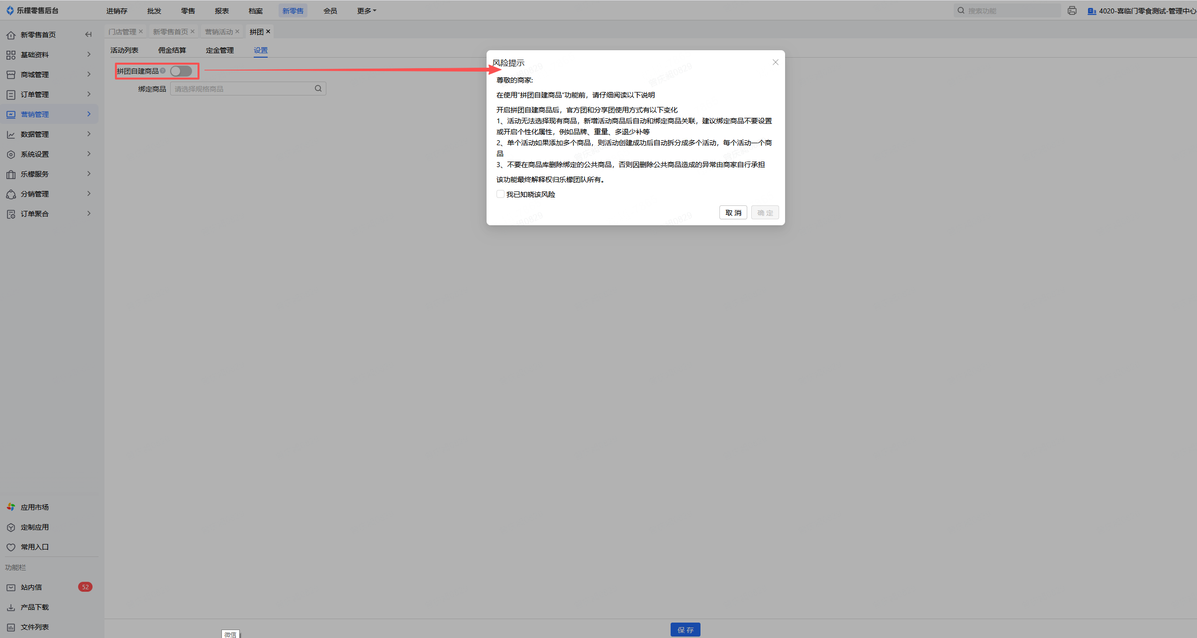 开启拼团自建商品开关,点击开启时会有【风险提示】弹窗,请仔细阅读风险提示,阅读完后如确定开启,勾选【我已知晓该风险】,然后点击确定
