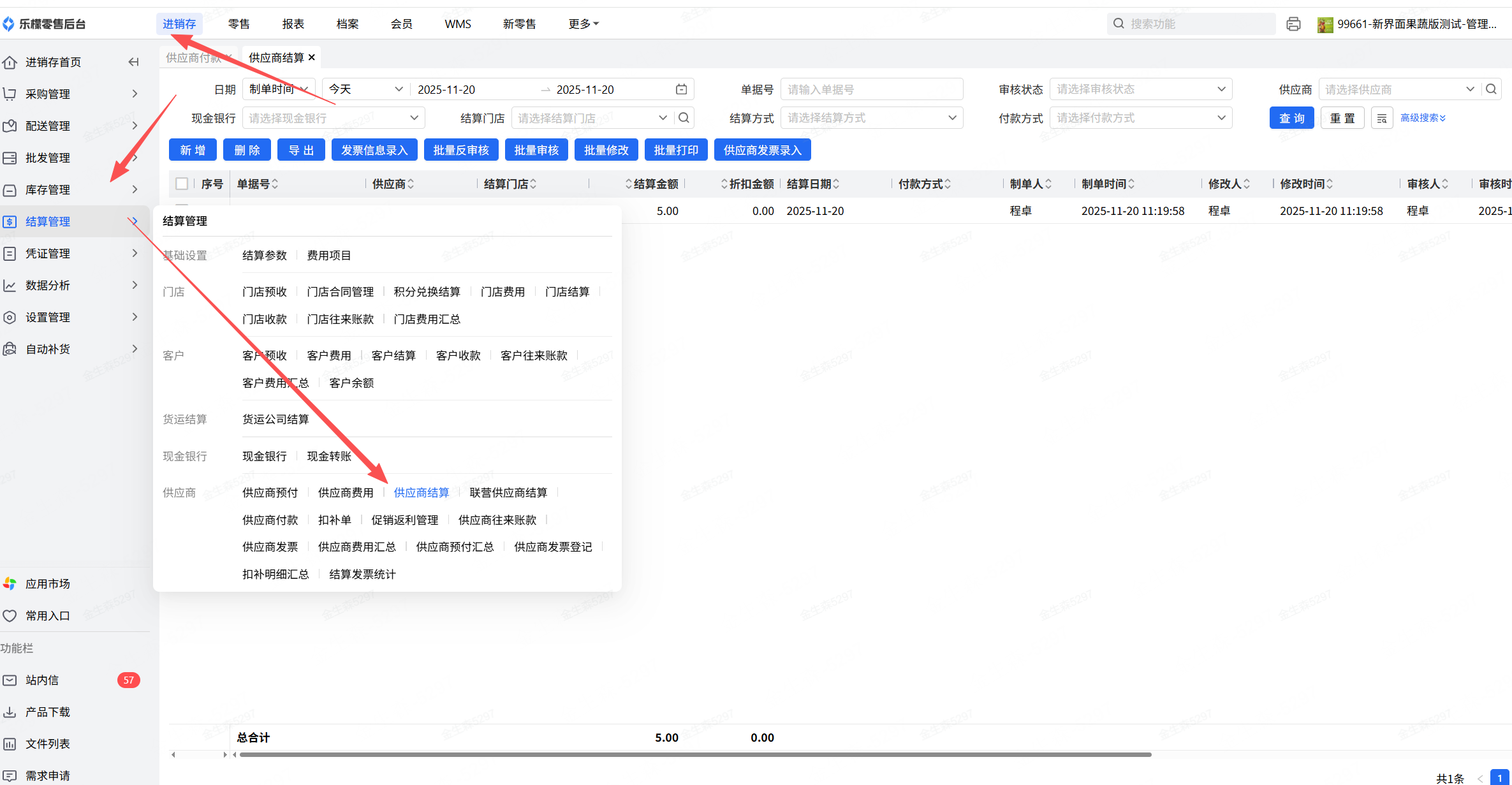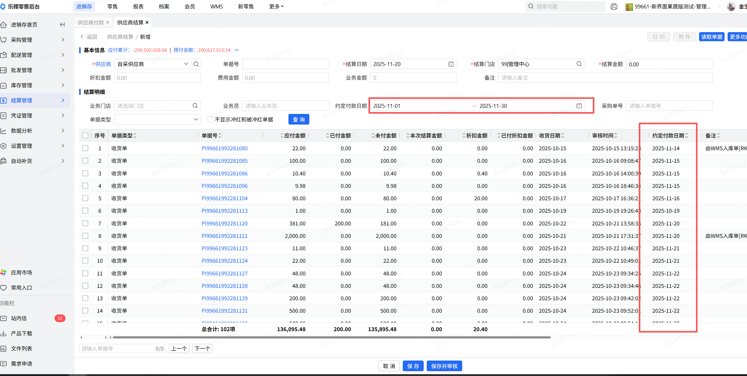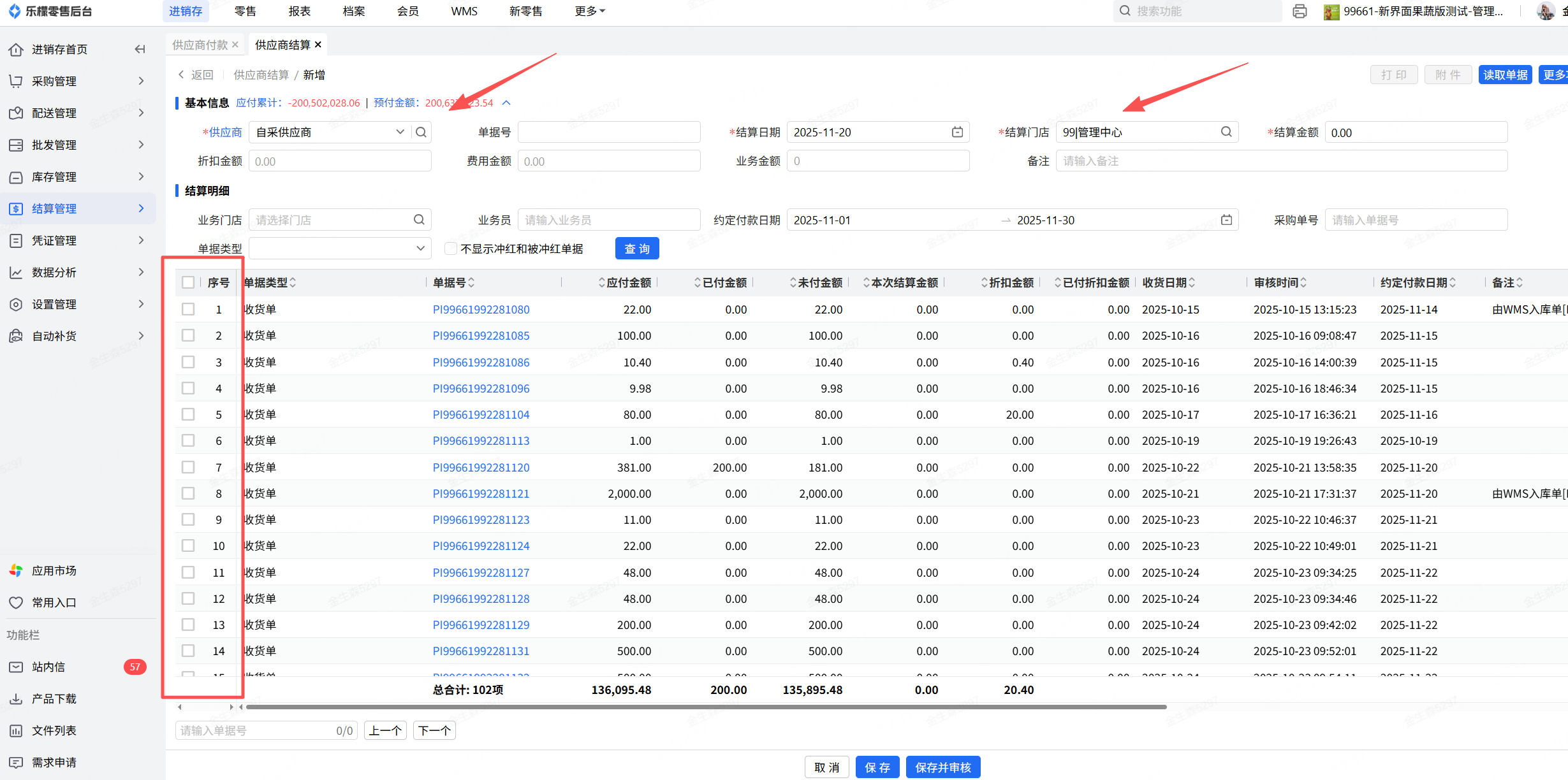 一般情况下,做供应商结算时,选择完结算门店和供应商后,会把此供应商名下所有未结算的业务单据拉取出来