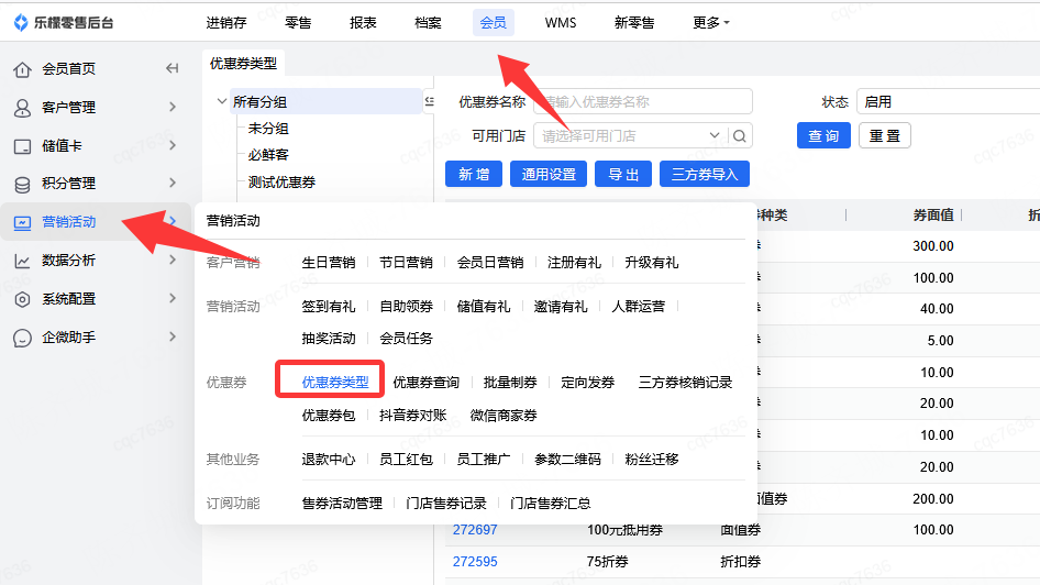 👉【操作路径】:1.会员-营销活动-优惠券类型