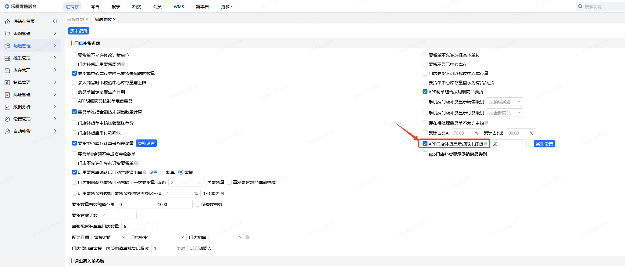 👉【操作路径】:进销存-配送管理-配送参数-app门店补货显示超期未订货