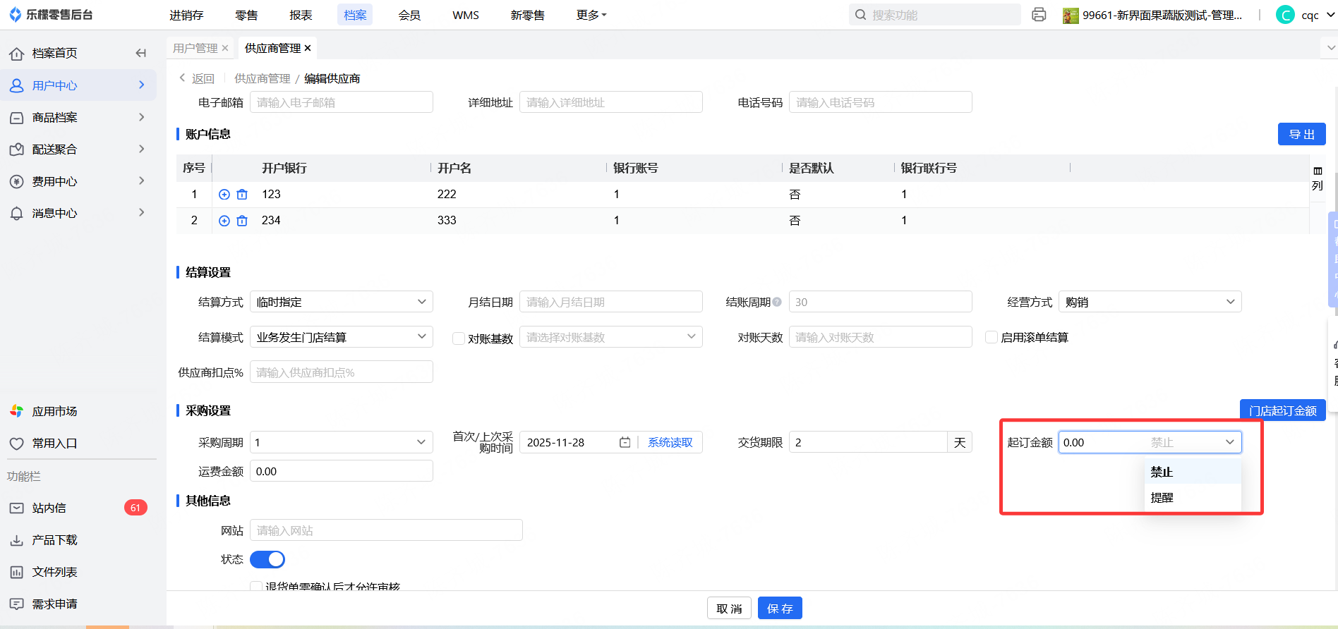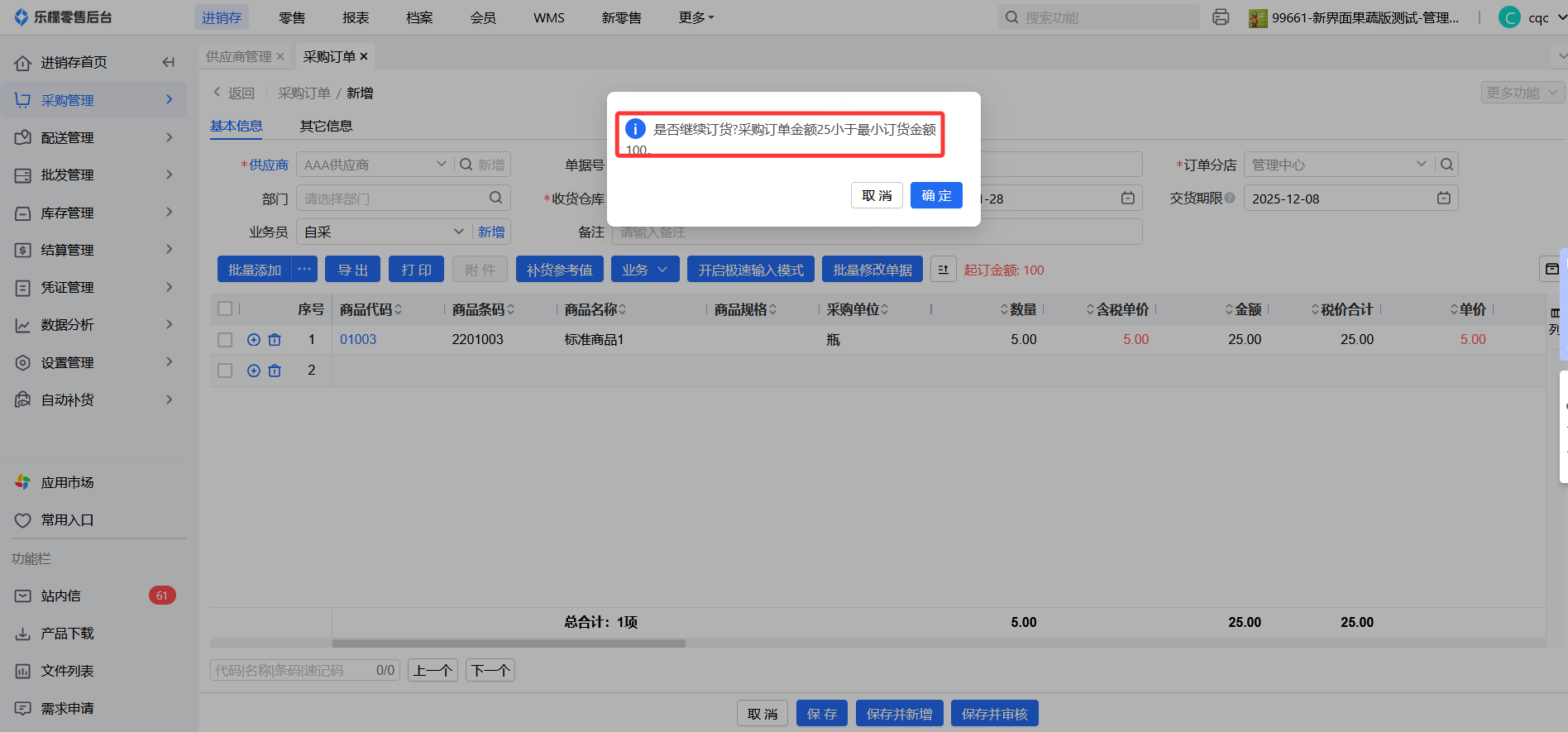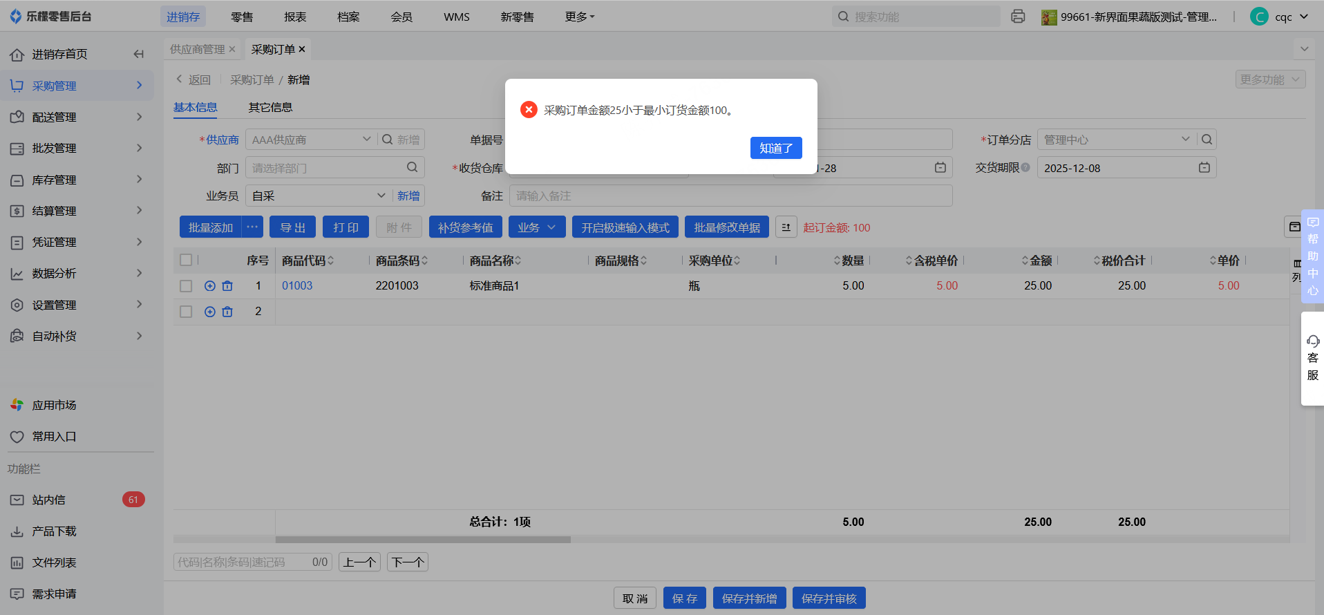 当单据金额小于起订金额时,审核时出现禁止/提醒弹窗