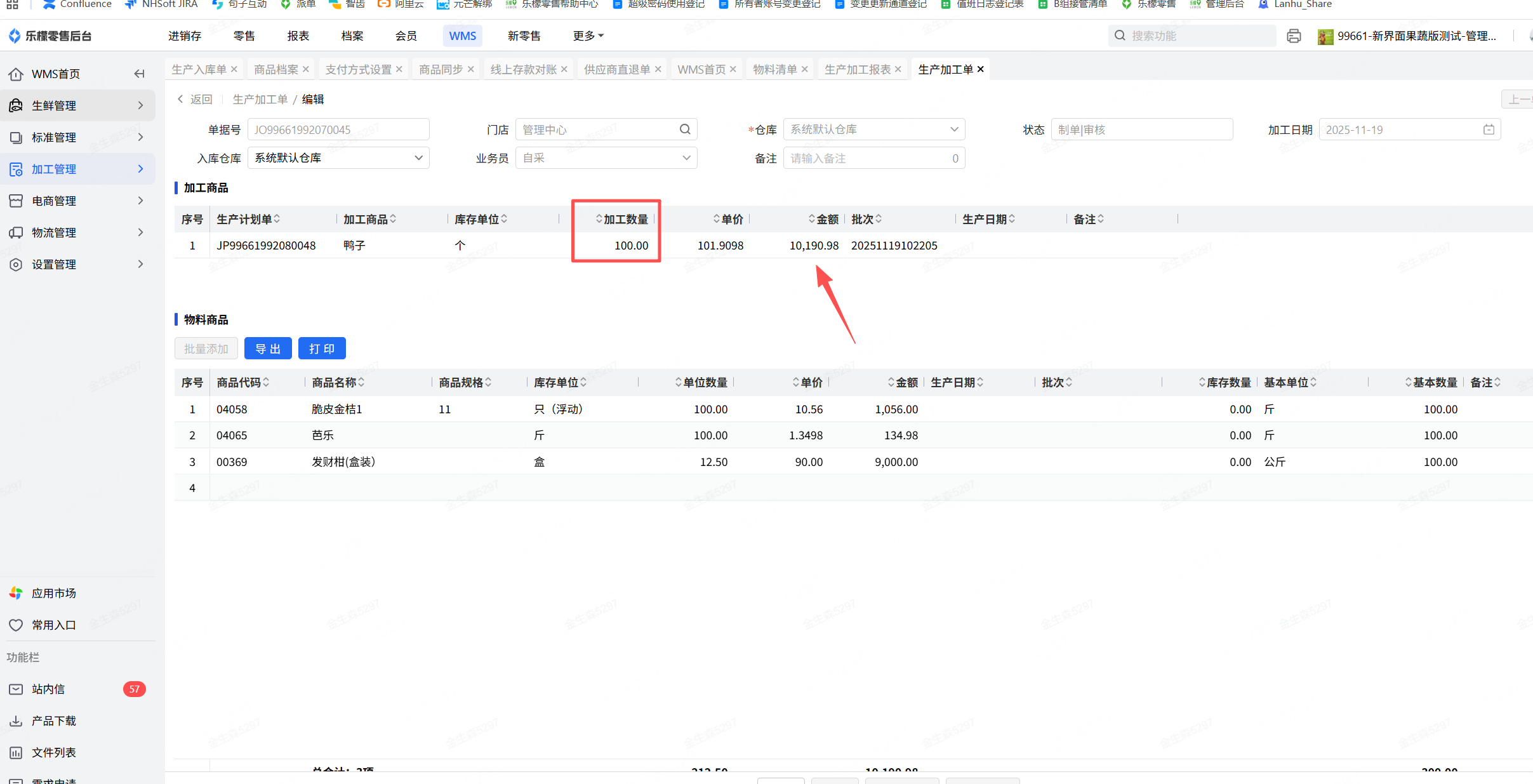 【生产加工单】用于真正进行加工操作的时候。每个【生产加工单】里面只有一张【生产计划单】里的一种加工成品,以及生产这种成品所需的原料商品。