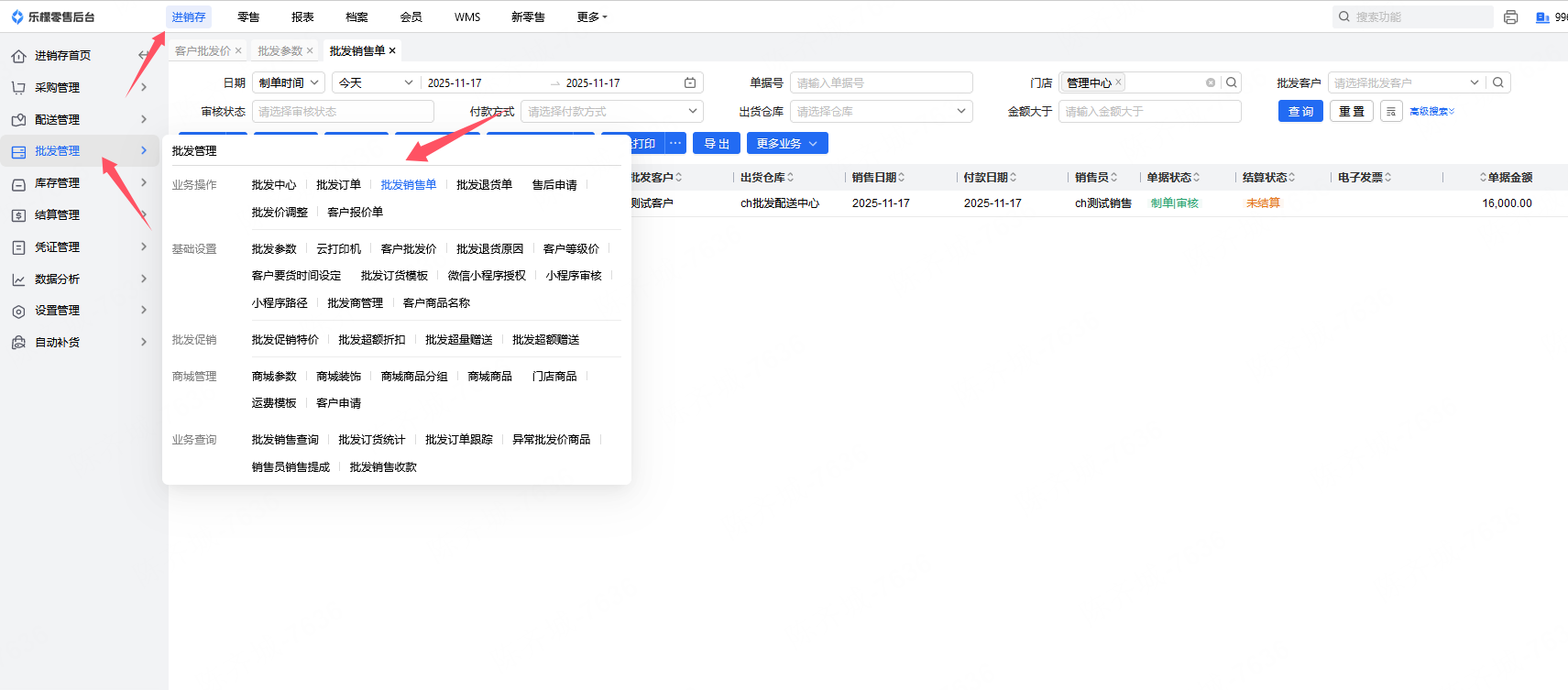 👉【操作路径】:进销存-批发管理-业务操作-批发销售单