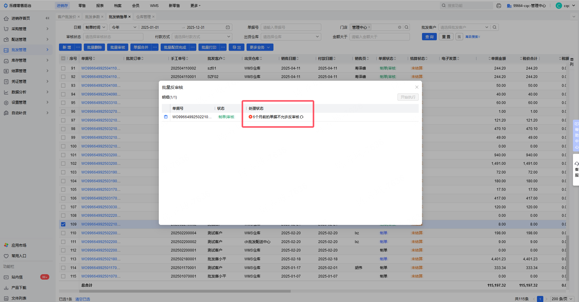 批发销售单反审核提示:6个月前的单据不允许反审核
