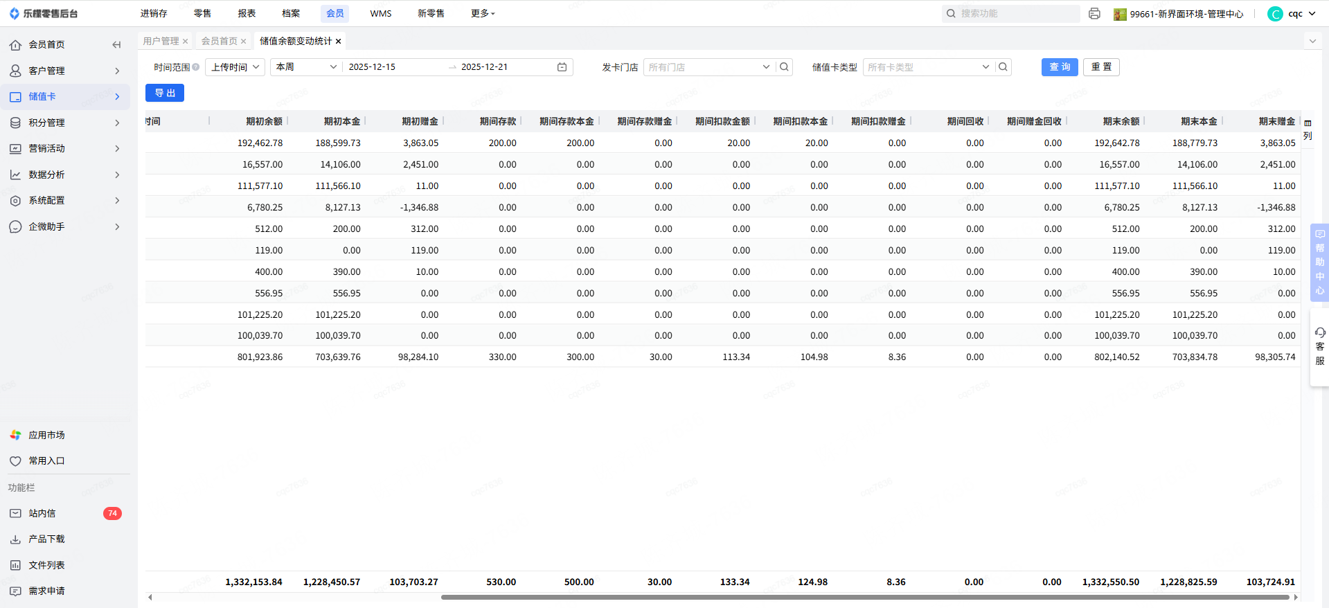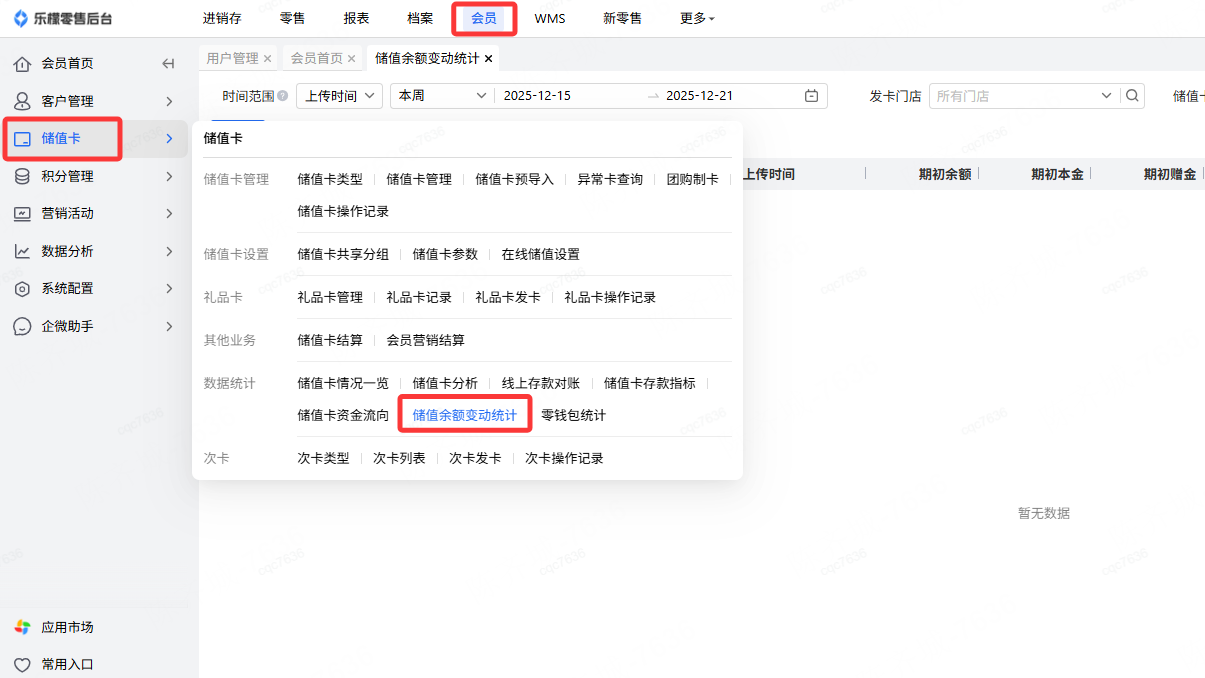 👉【操作路径】:会员-储值卡-数据统计-储值余额变动统计