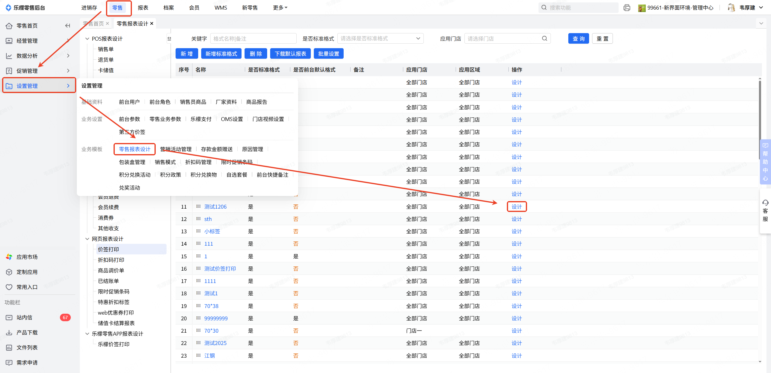 👉【操作路径】:1.零售-设置管理-零售报表设计