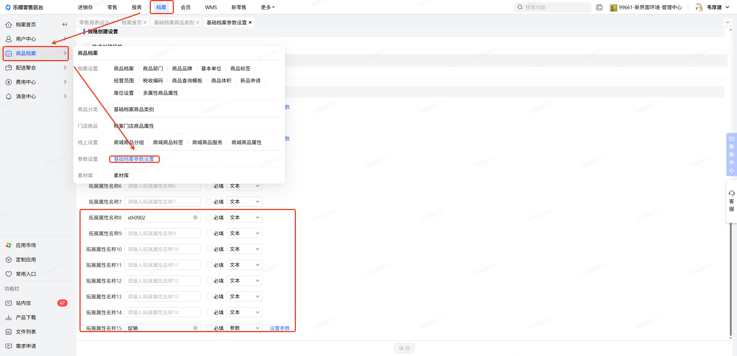 3.设置拓展属性,路径:档案-商品档案-基础档案参数设置