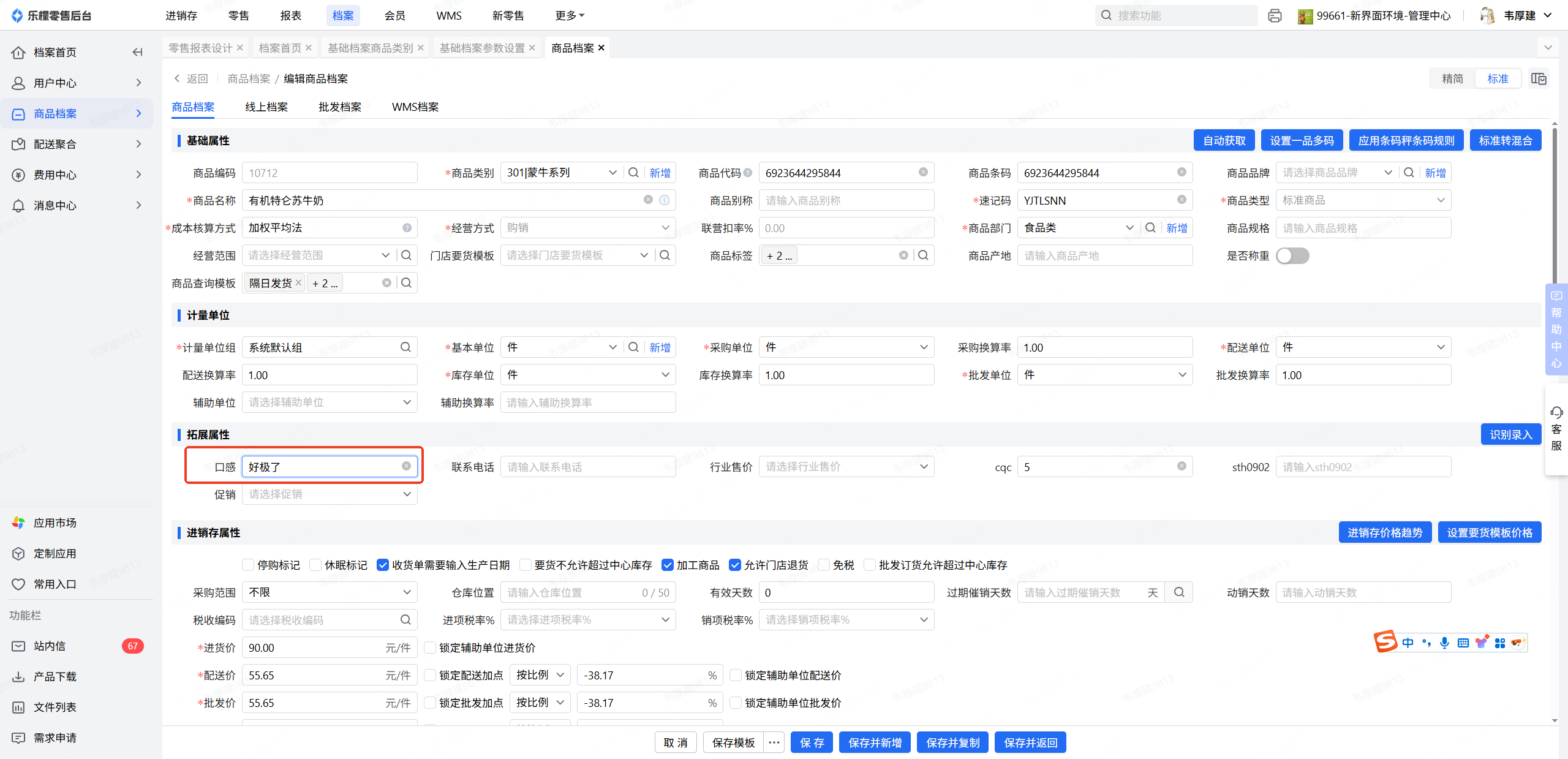4.设置好拓展属性之后商品档案就会有一行添加内容