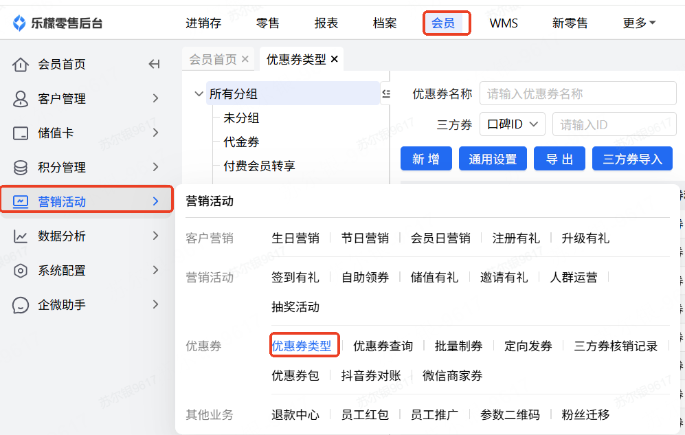 【操作路径】:会员-营销活动-优惠券类型