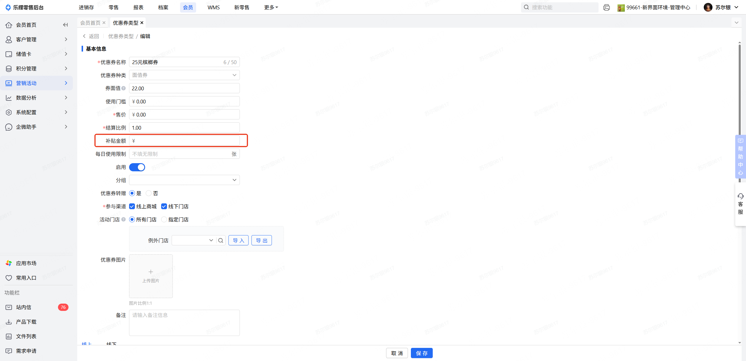 在需要设置的对应券类型/编辑详情页里设置好补贴金额