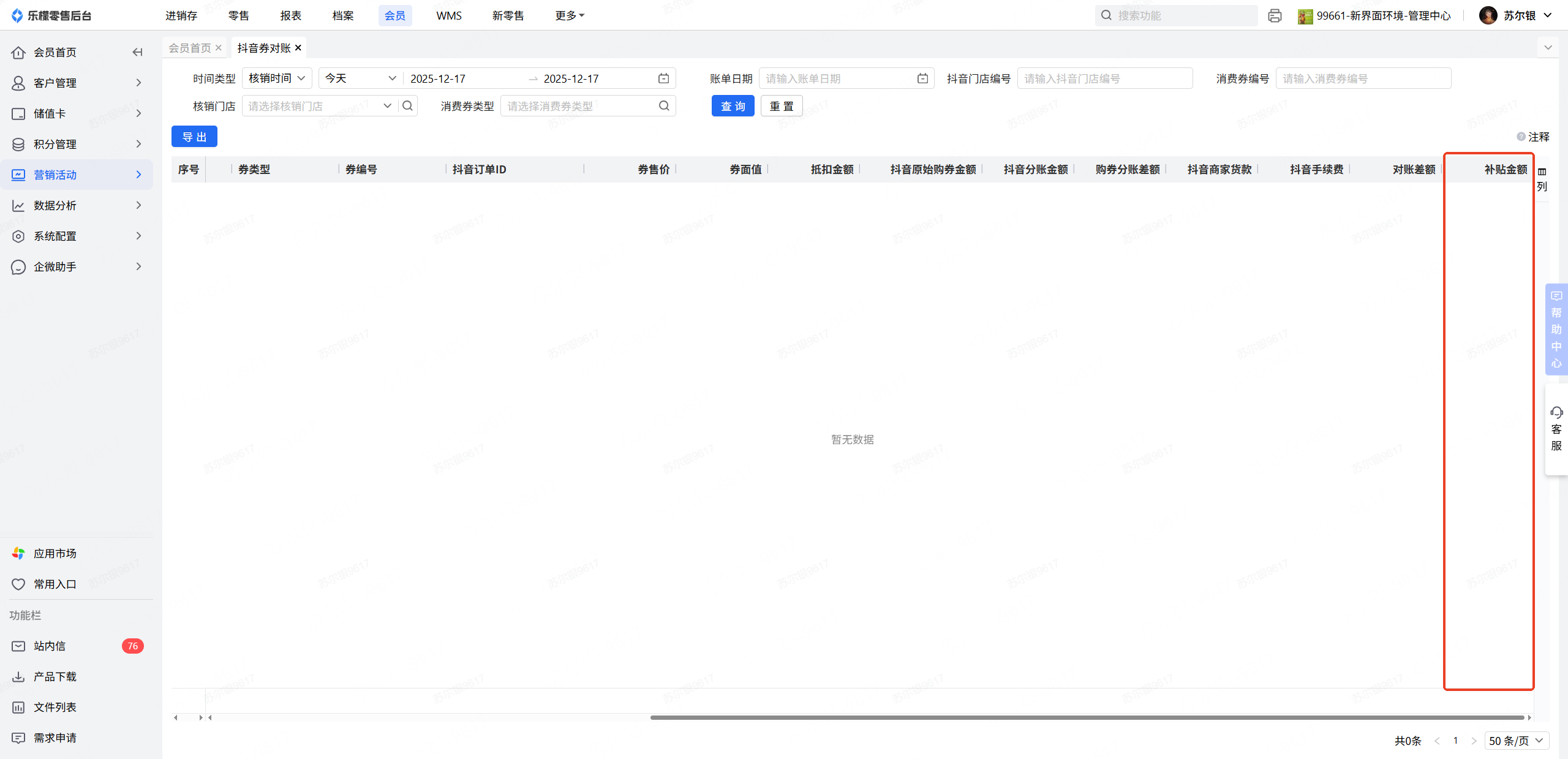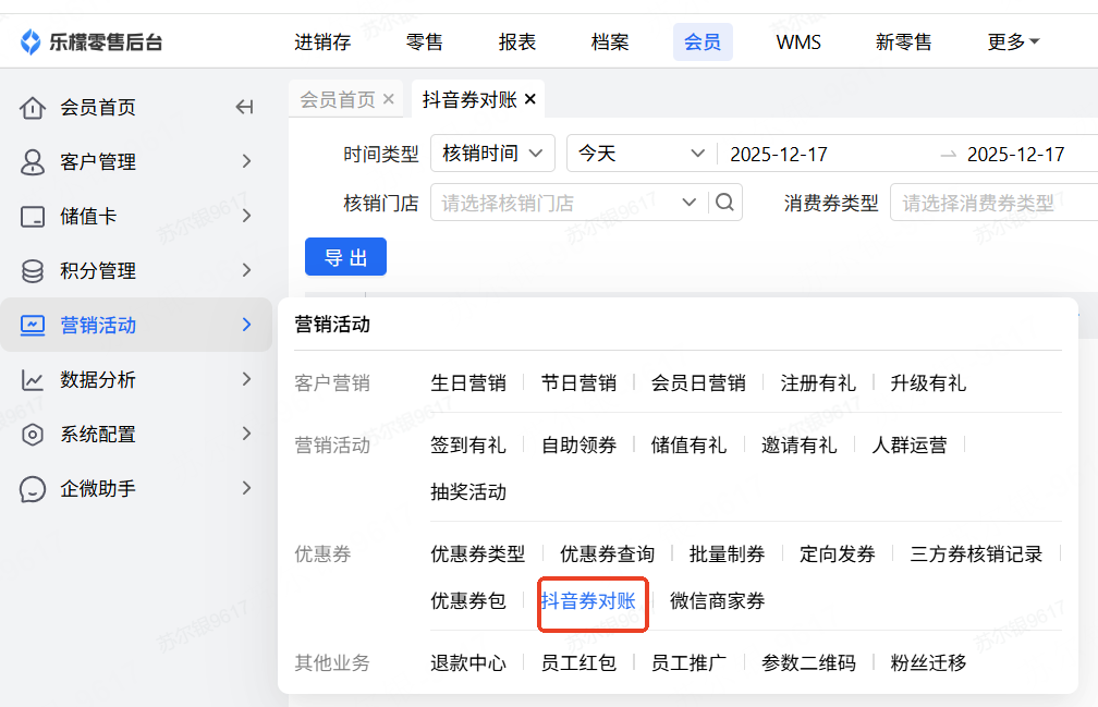 【操作路径】:会员-营销活动-抖音券对账