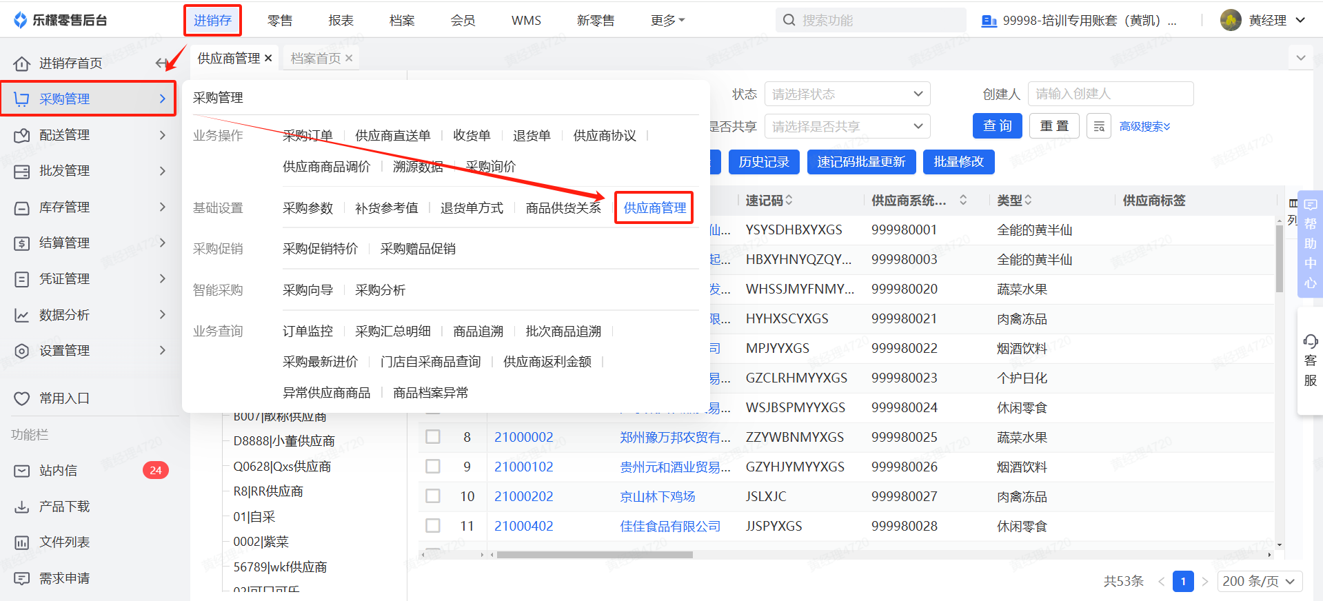 👉【操作路径】:1.登录后台进入经销存模块 - 2.点击采购管理模块,供应商管理