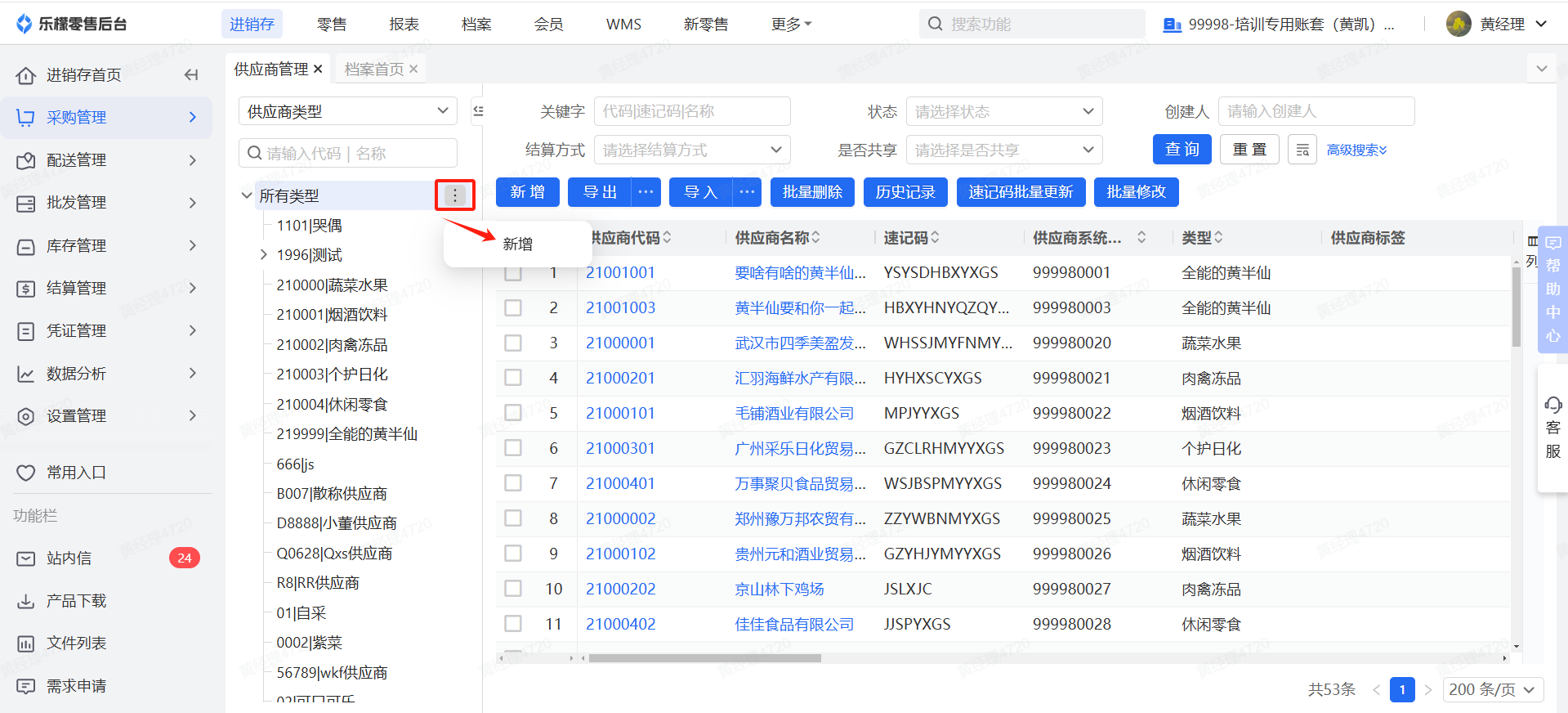 👉【操作路径】:1.选择对应批发商的类别 - 2.点击新增按钮