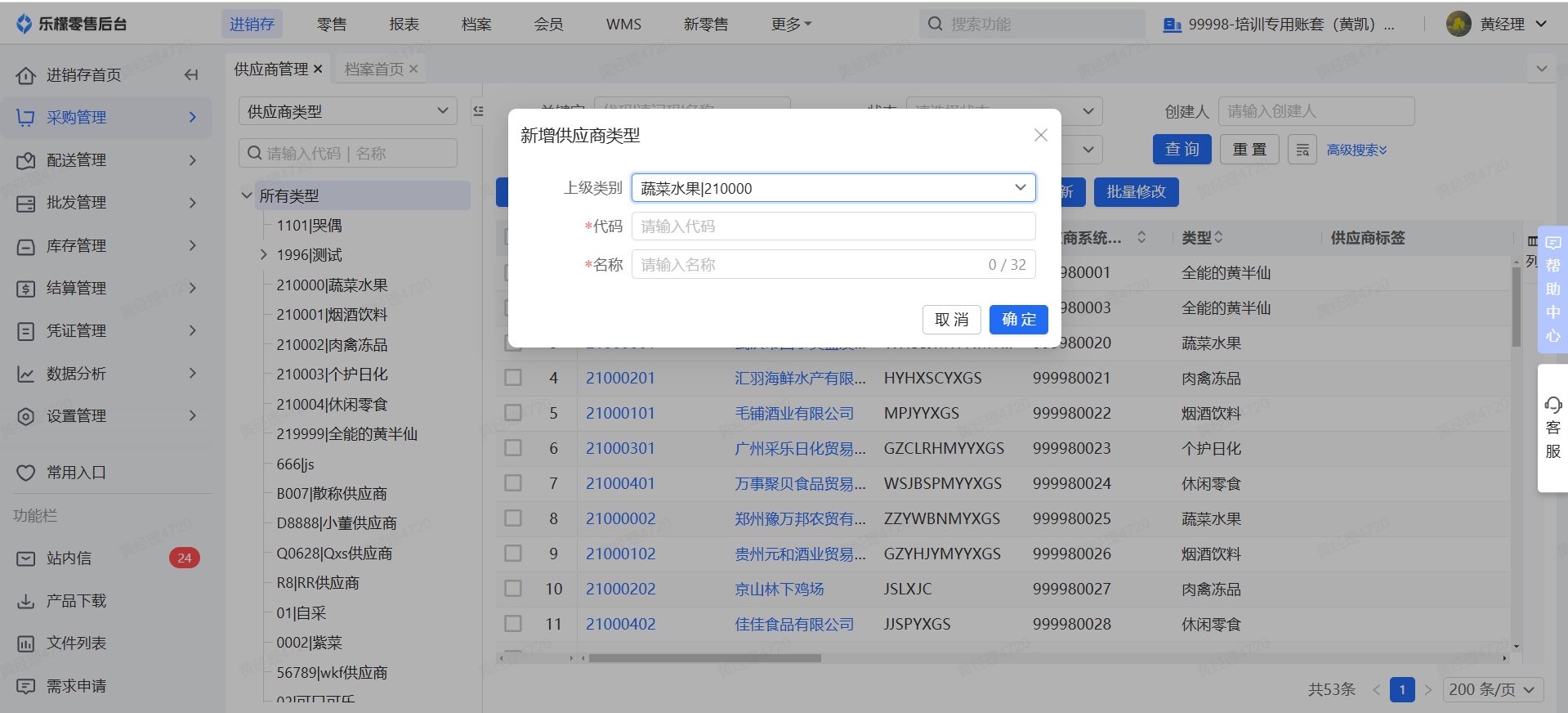 👉【操作路径】:1.选中所有供应商类别,点击最右边的符号 - 2.点击新增 - 3.填入对应类别的代码(代码不可重复)和类别名称,如果是在一级类别下的供应商类型,需要选择对应父类(一级类别)。