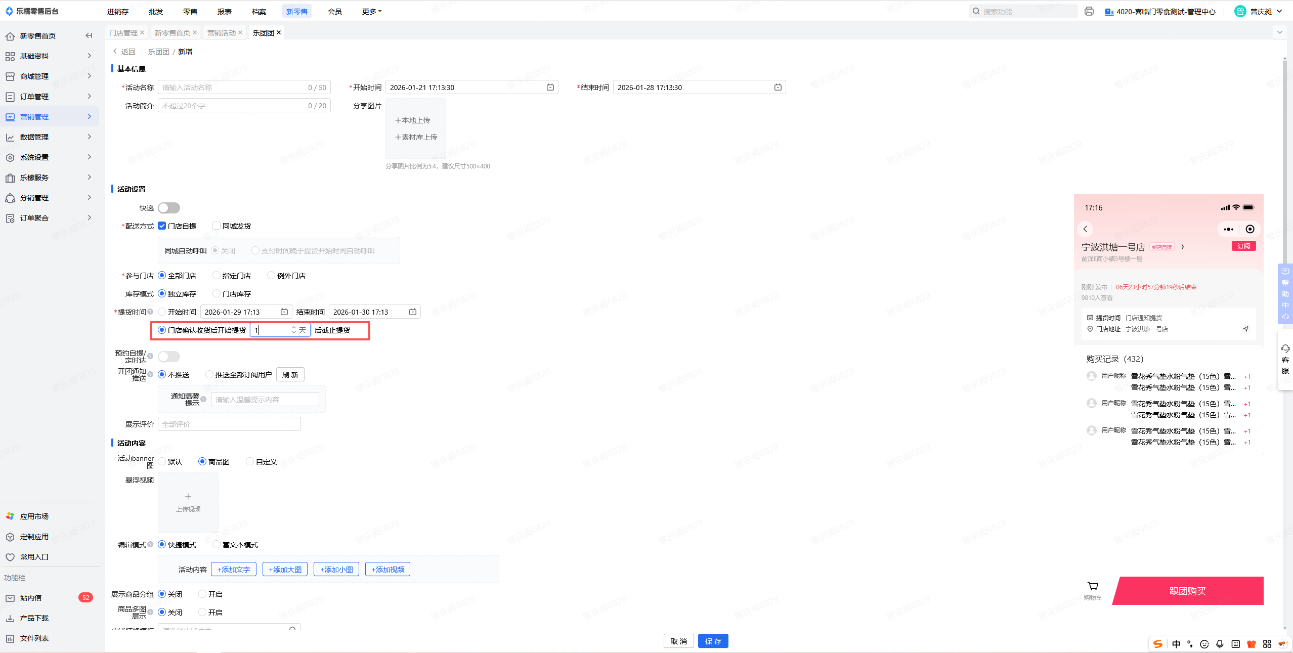 新增乐团团活动时,活动内提货时间设置选择【门店确认收货后开始提货】