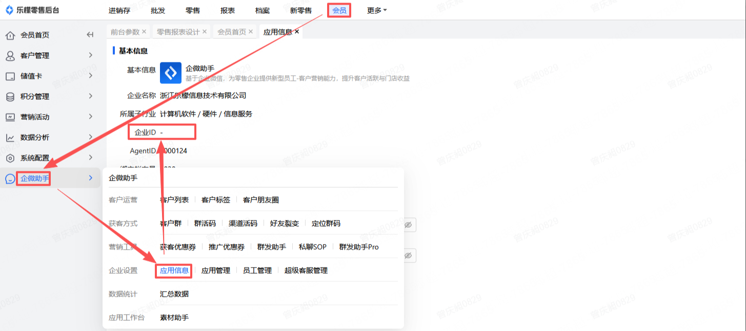 企业ID位于【企微助手】-【企业设置】-【应用信息】(最好使用此处的企业ID而不是企微后台的企业ID)