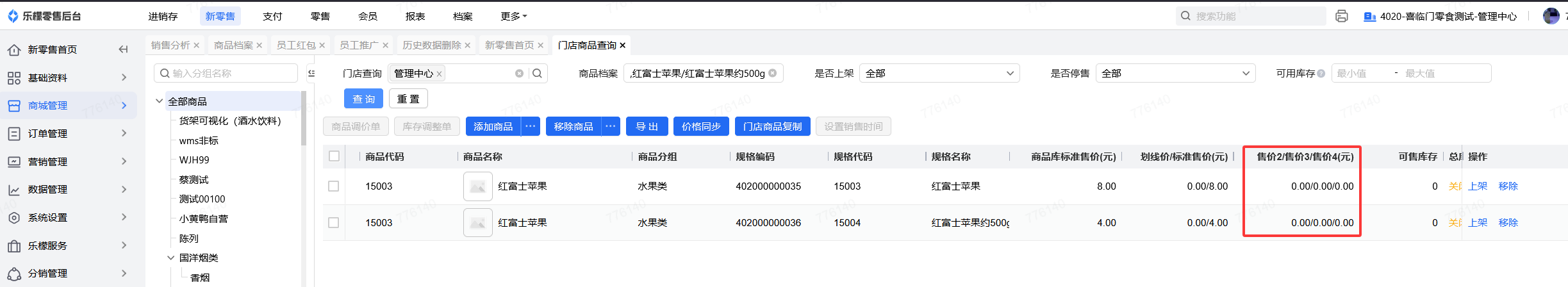 此界面可查看到规格级的商品在所选线上门店中的标准售价、售价2、售价3、划线价,以及库存余量、是否上下架、停售等信息