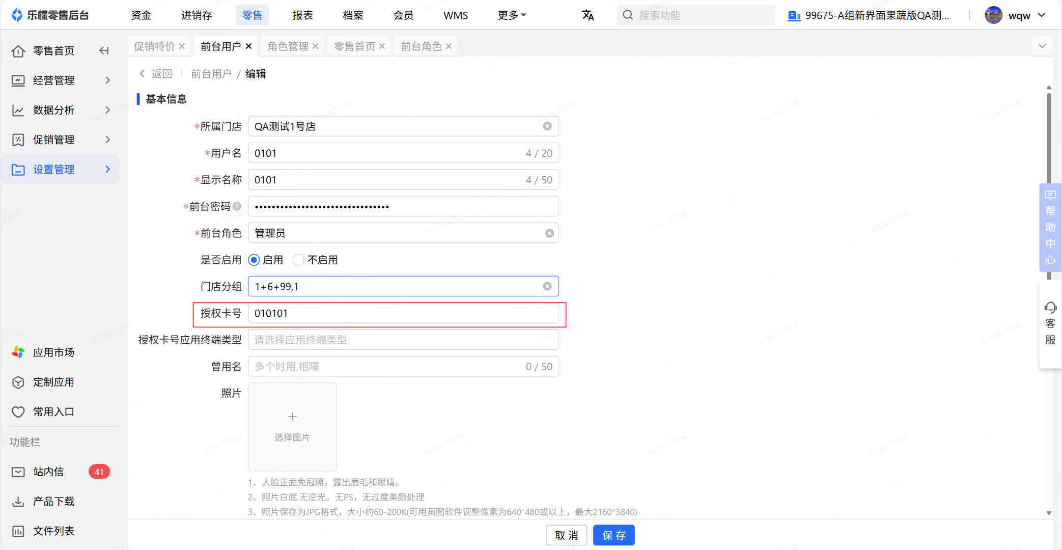 增加编辑权限控制:零售-设置管理-基础资料-前台用户-授权卡号-编辑;若无权限,则禁用不可编辑