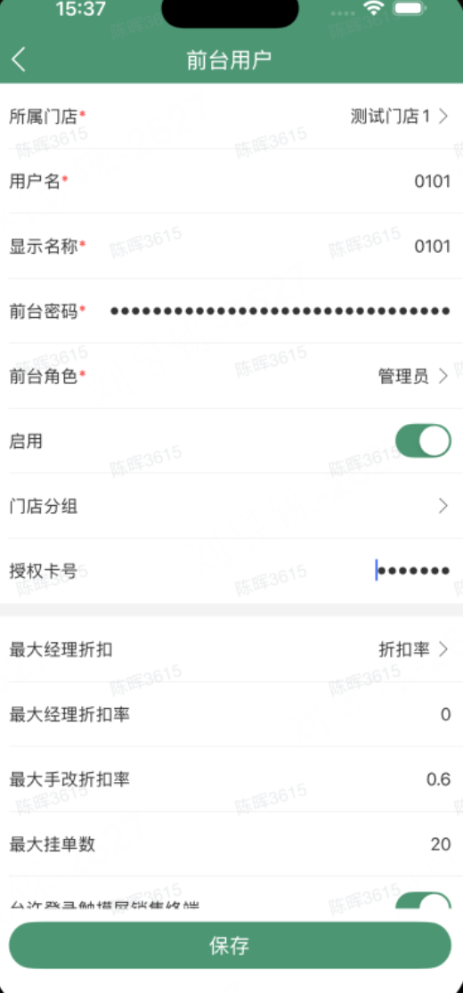 客户通过授权卡给门店授权。同时因为收银员流动比较大,把前台用户的新增权限下放给门店。需要控制门店可以修改前台用户,但是不能查看和编辑授权卡号,防止员工内盗。