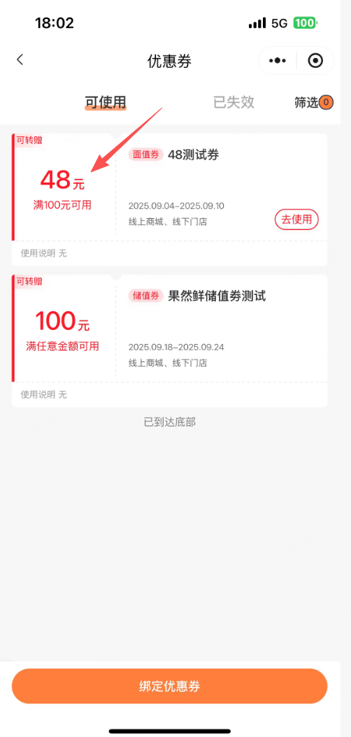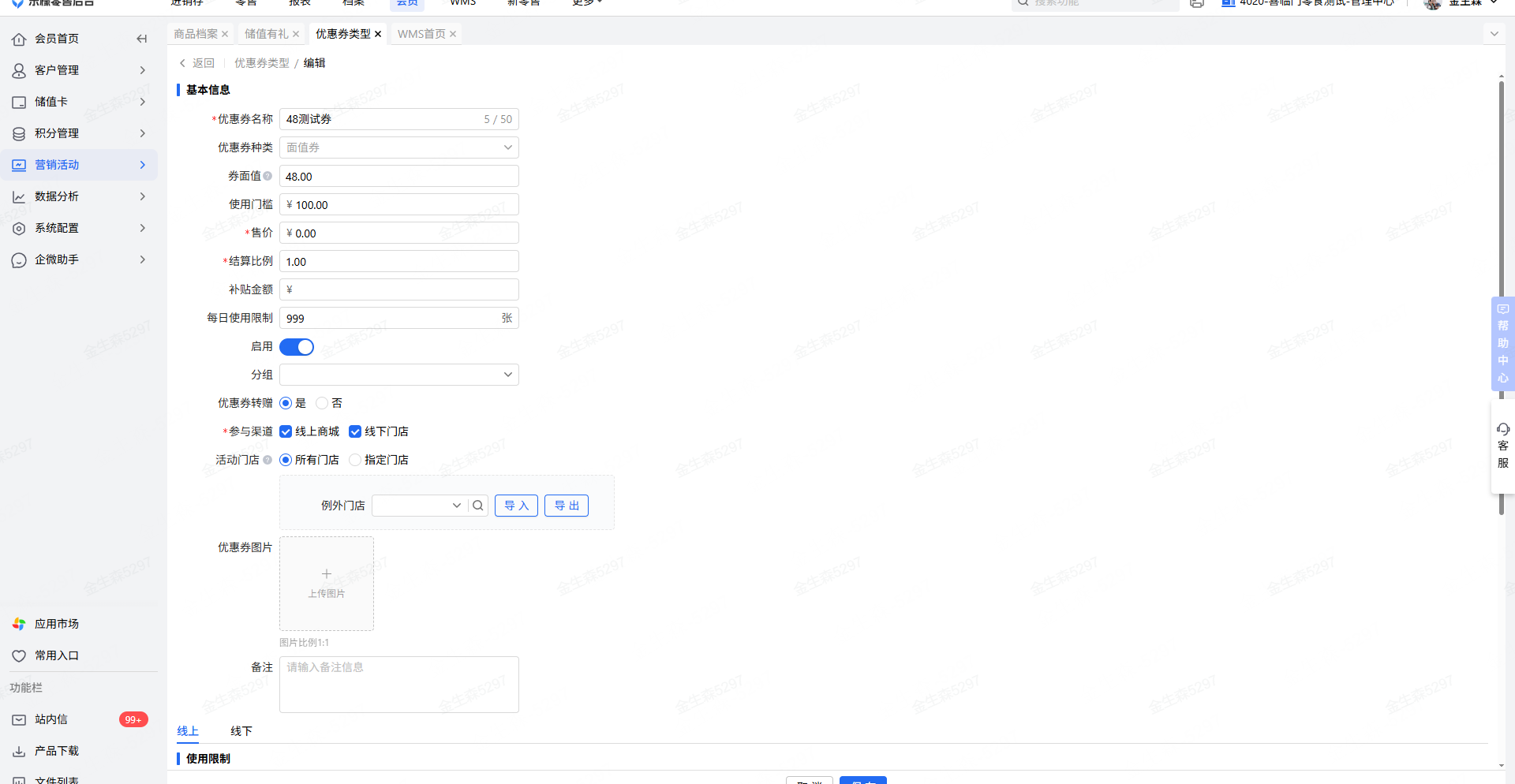 实例:如图,新增一张满100减48的优惠券,所有门店所有商品都能使用,每日限制999张