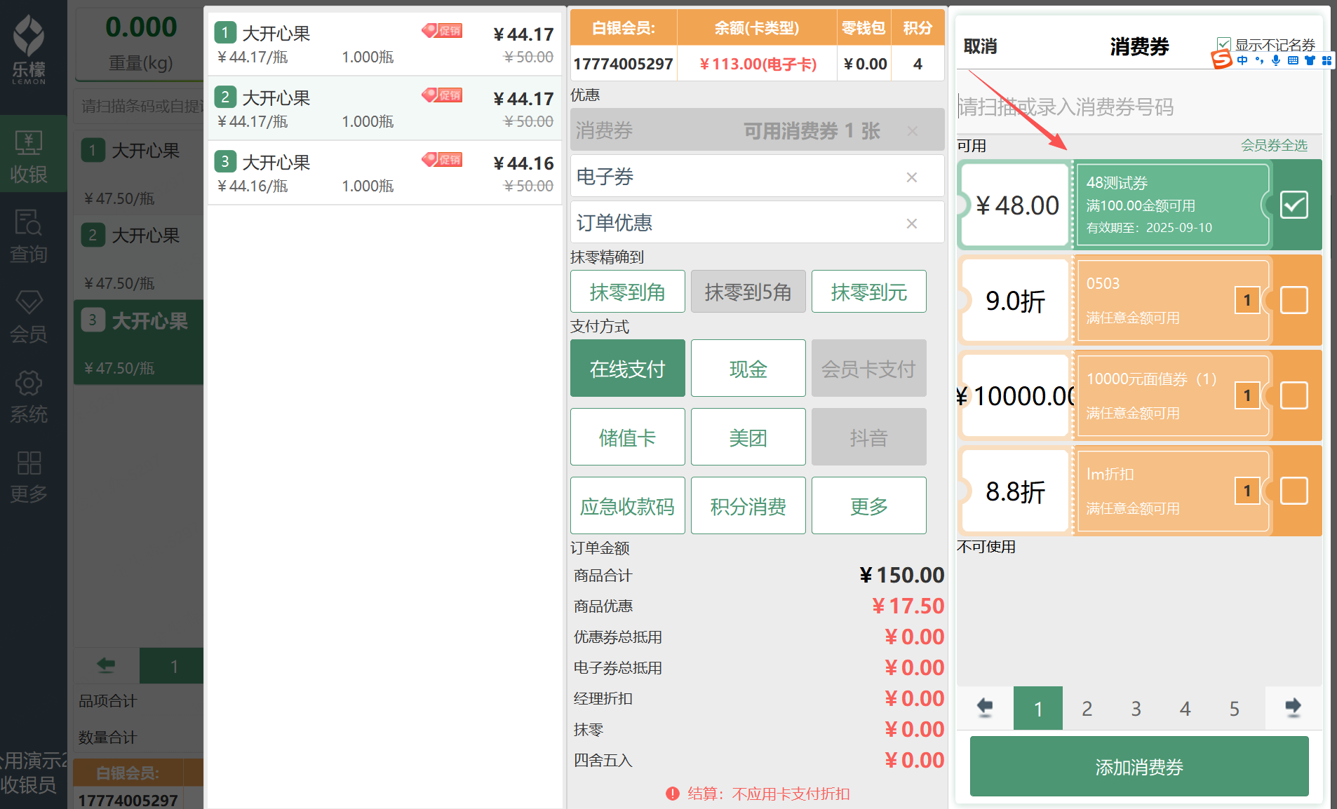 通过活动发送后前台会员录入,点击结算选择消费券,点击确定即可结算
