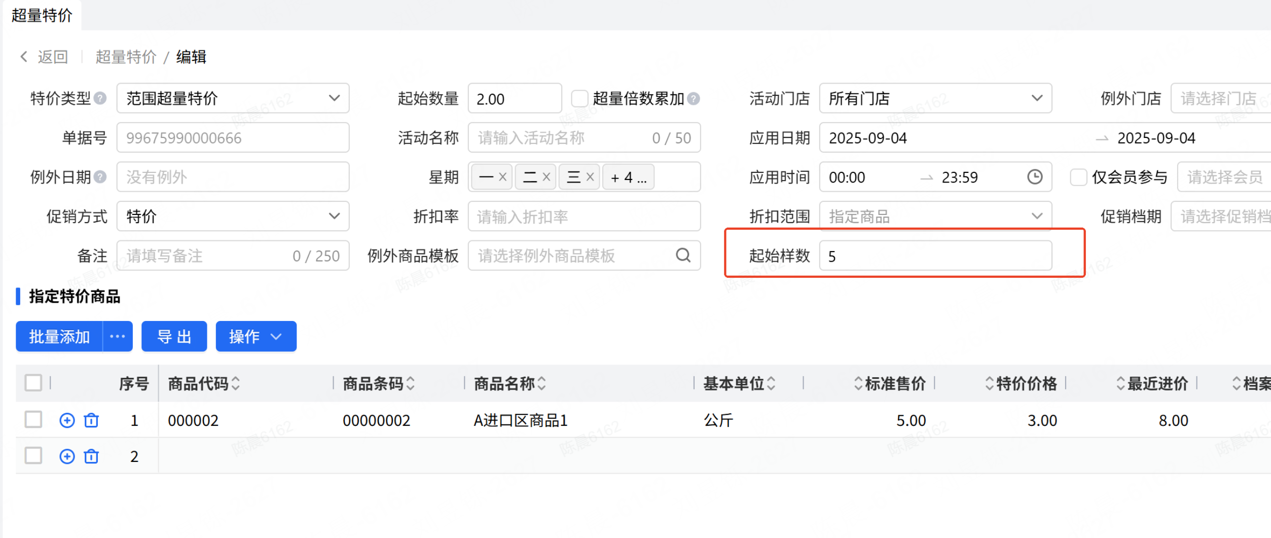 零售【超量特价】范围超量特价新增促销配置:起始样数