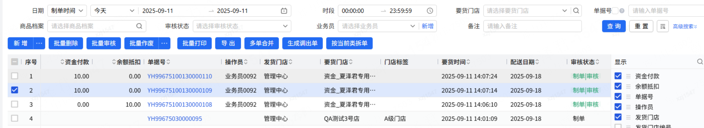 tab-要货单状态,增加列“资金付款、余额抵扣”,默认不显示