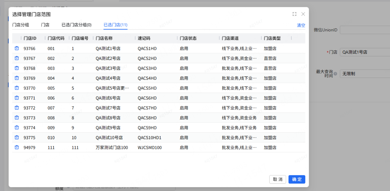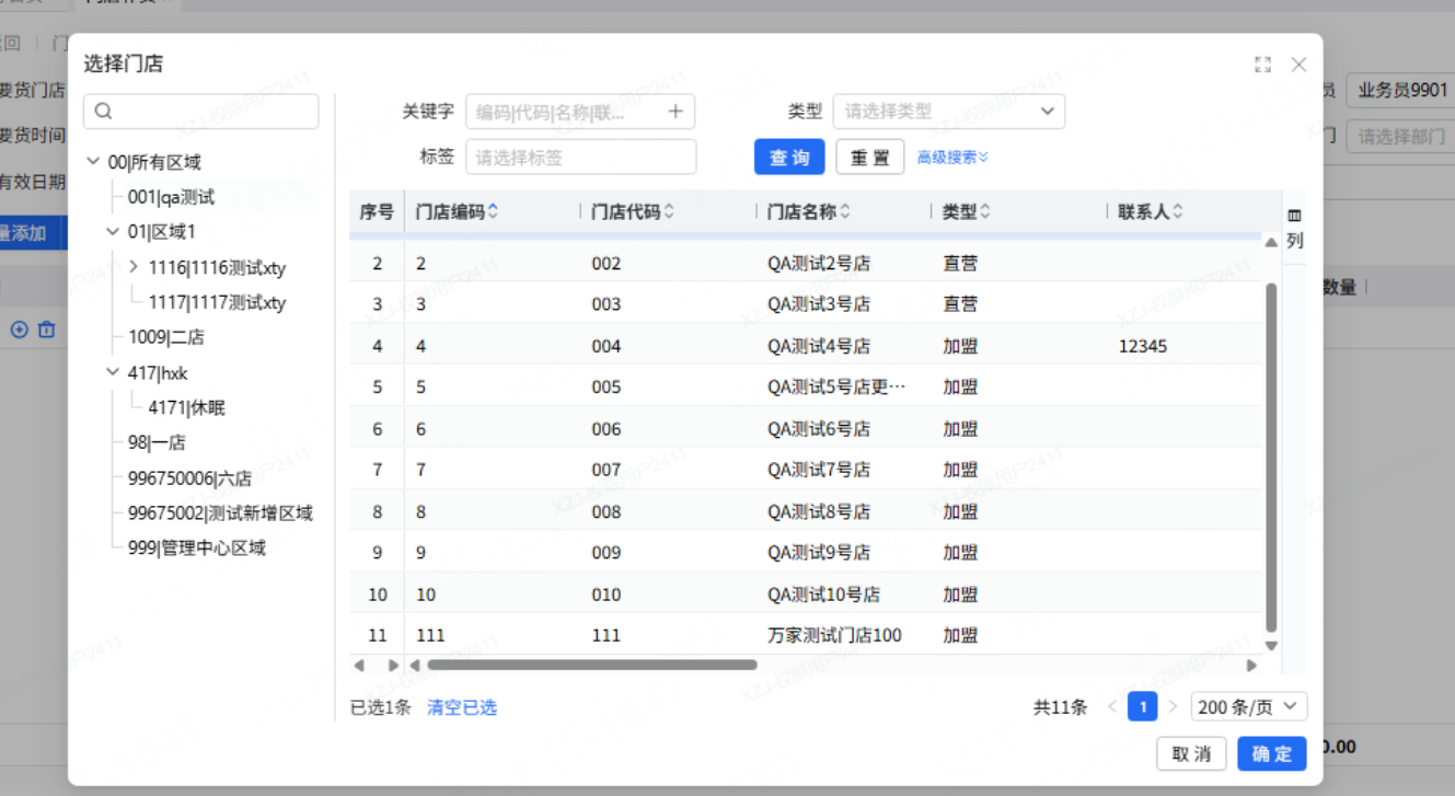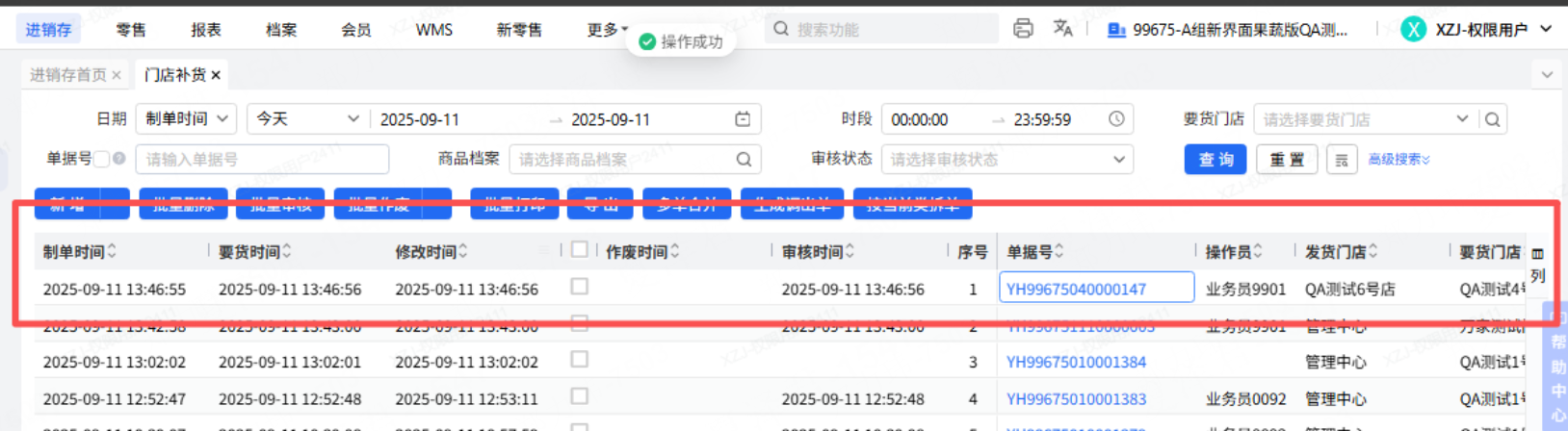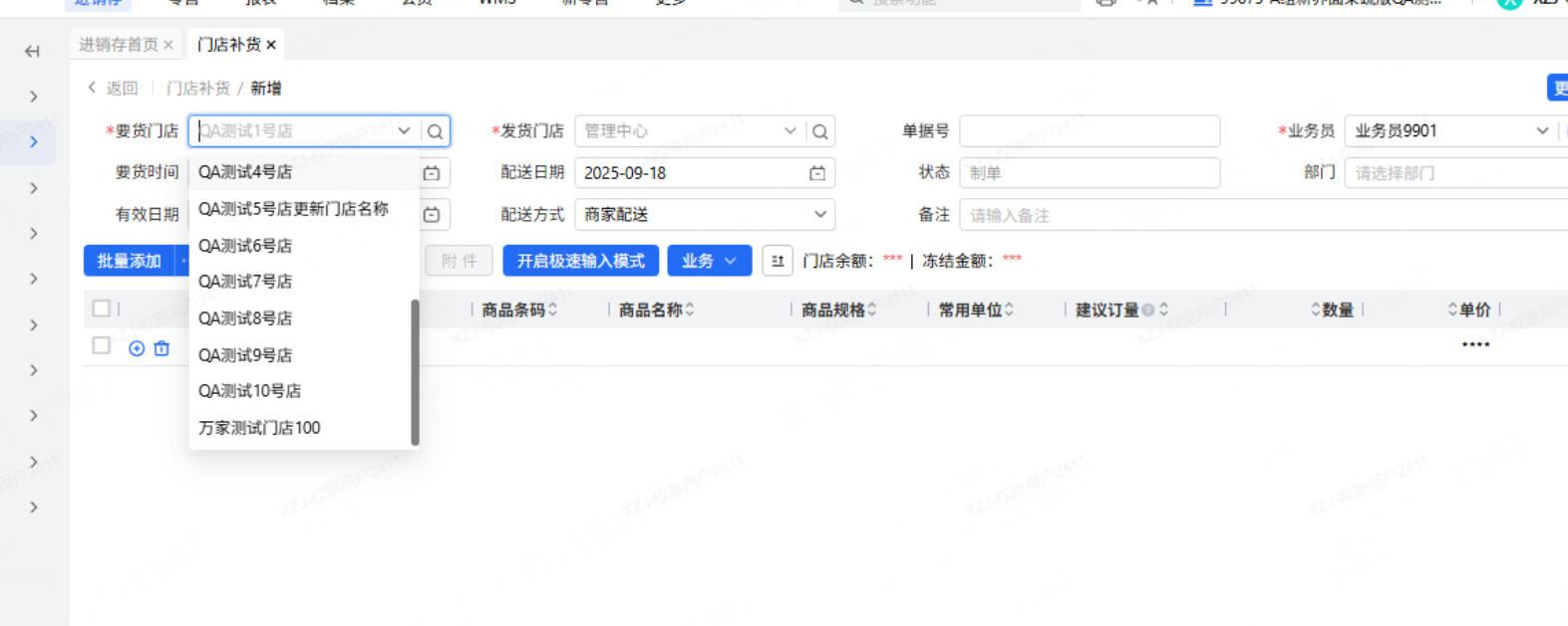 要点:门店所属门店是门店1,分组是门店1、2 但是当登录门店为门店1时做门店补货,门店只能选择门店1,选择不到门店2。但是APP是可以选择的 且其他业务单据如收货单是可以选择门店1、2