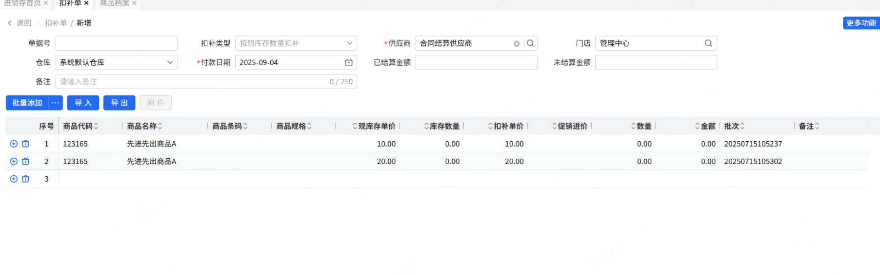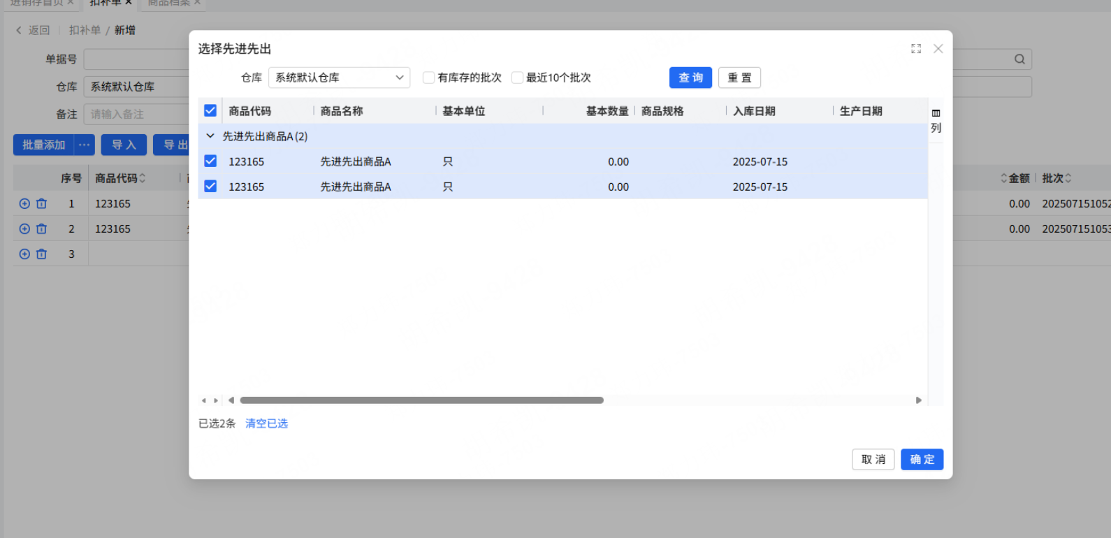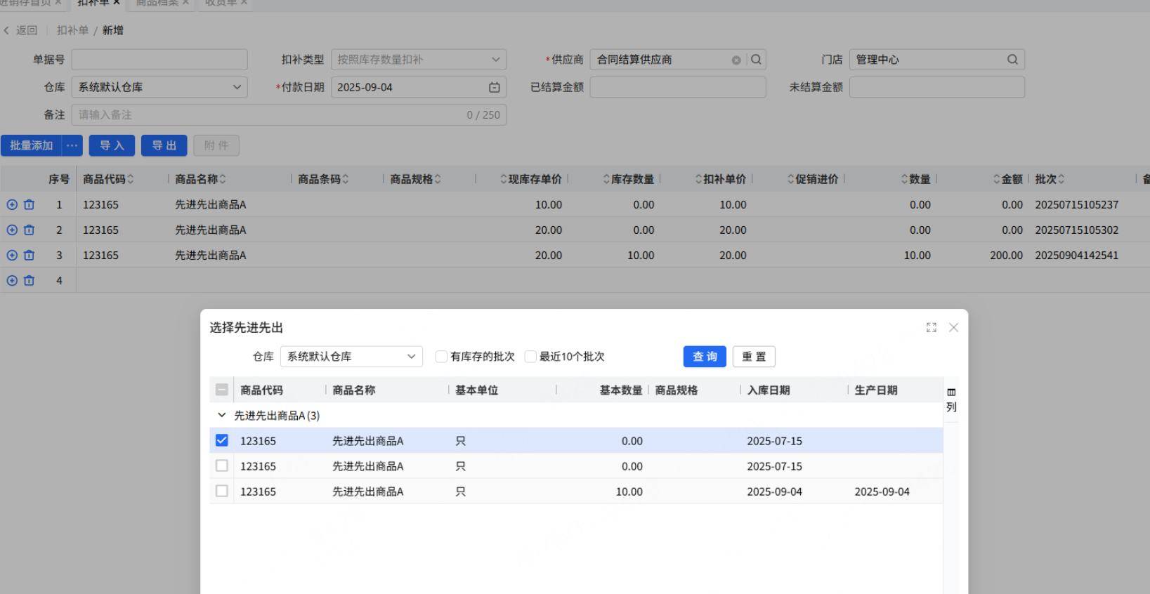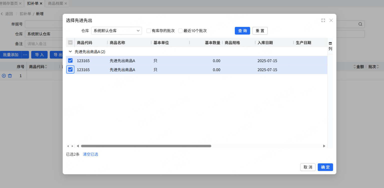要点:目前系统在操作先进先出商品库存扣补时,当需要针对按不同批次操作扣补时,弹窗不支持复选多选选入,只能单次的方式去添加