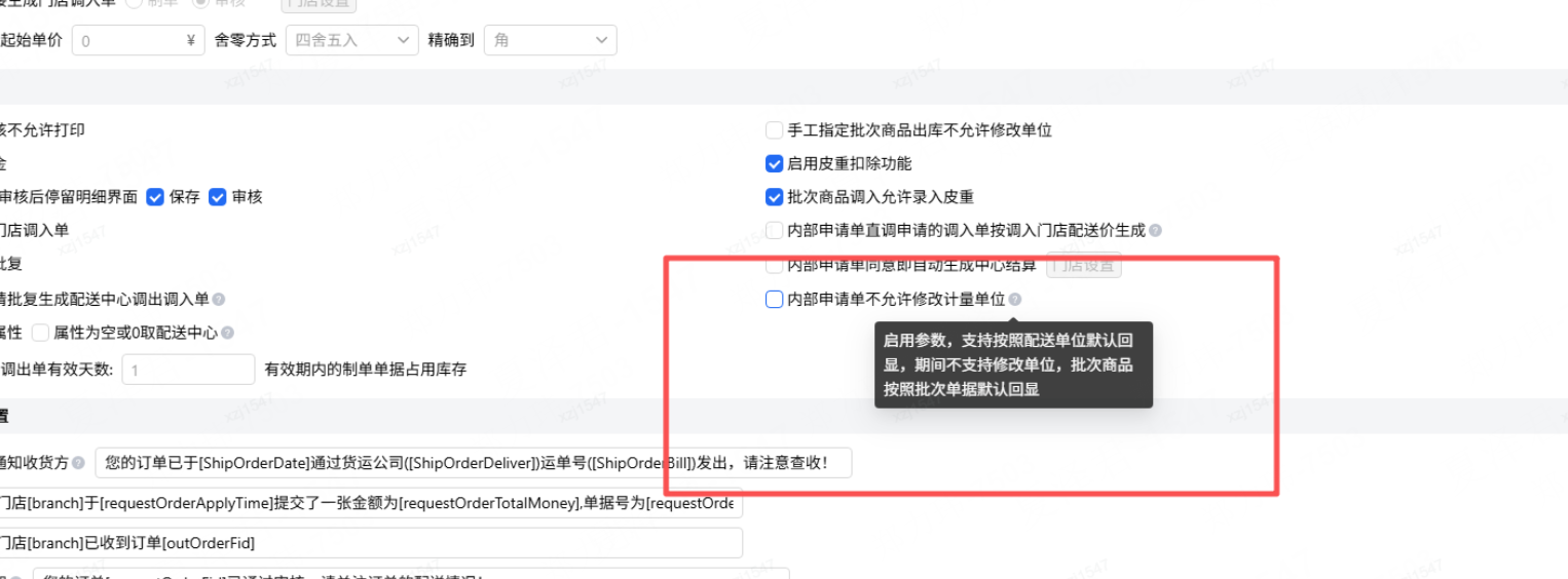 勾选后,对应web/app内部申请单仅支持配送单位,不允许修改单位