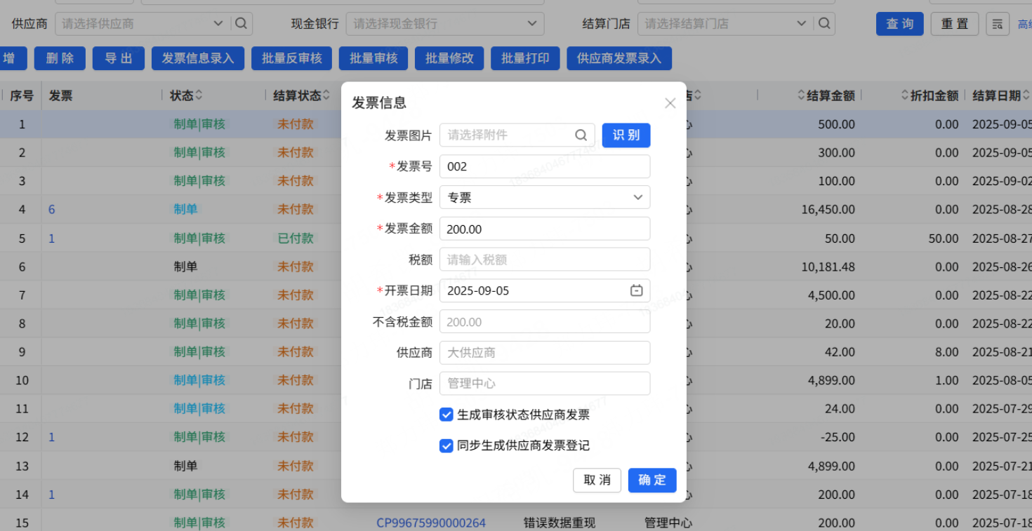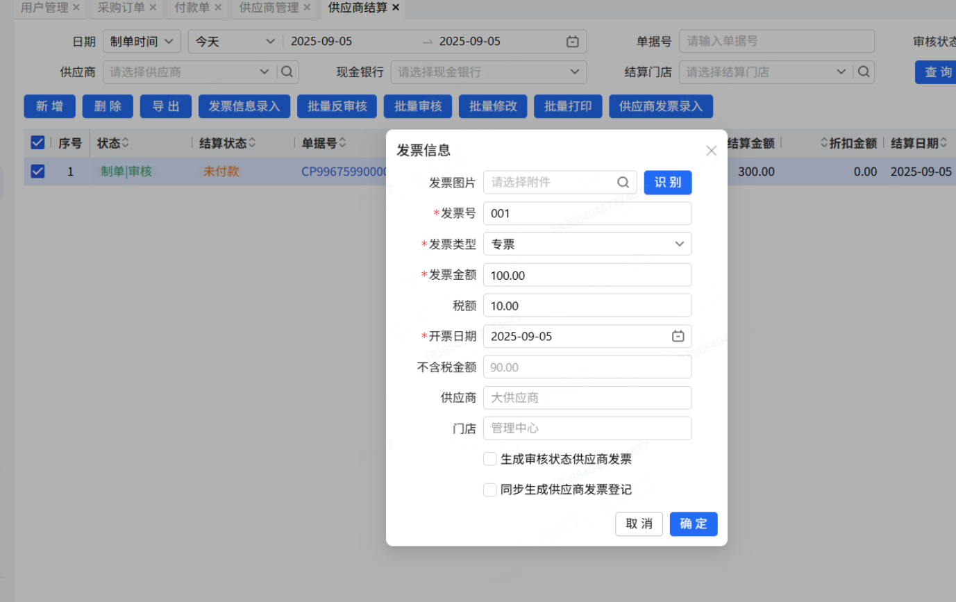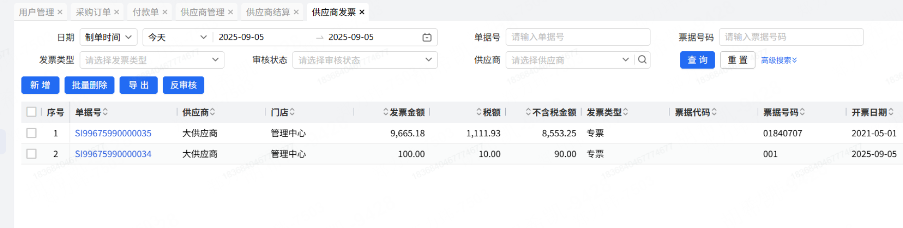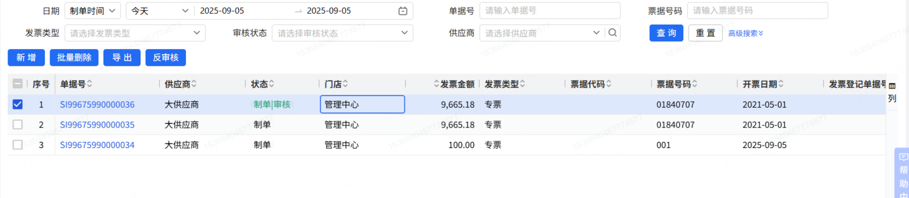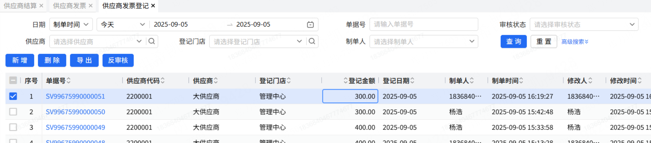 勾选:同步生成供应商发票登记,状态=制单,生成的供应商发票登记数据如下