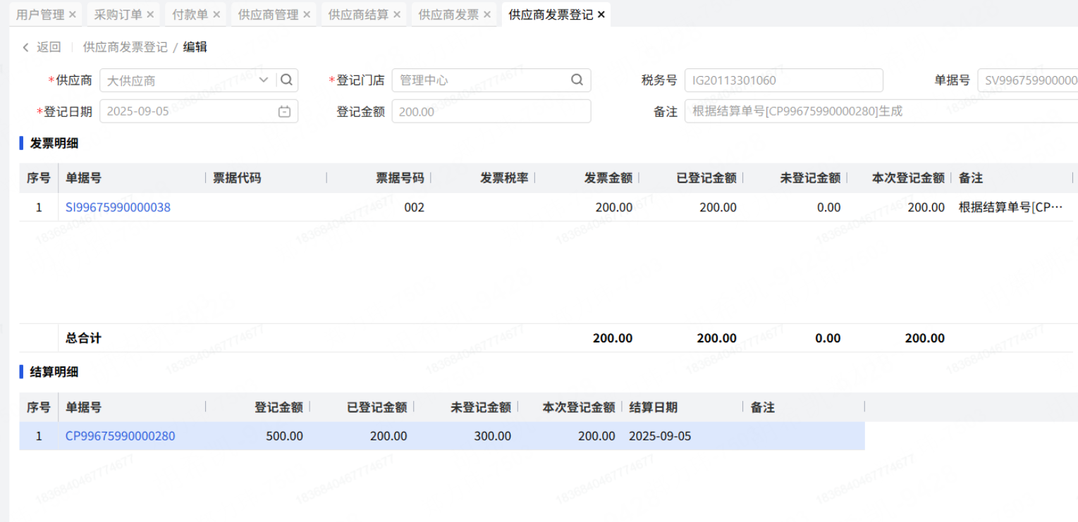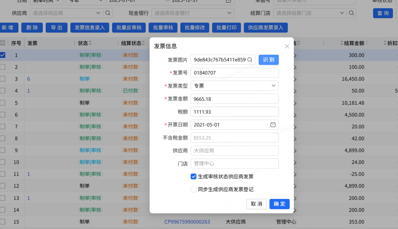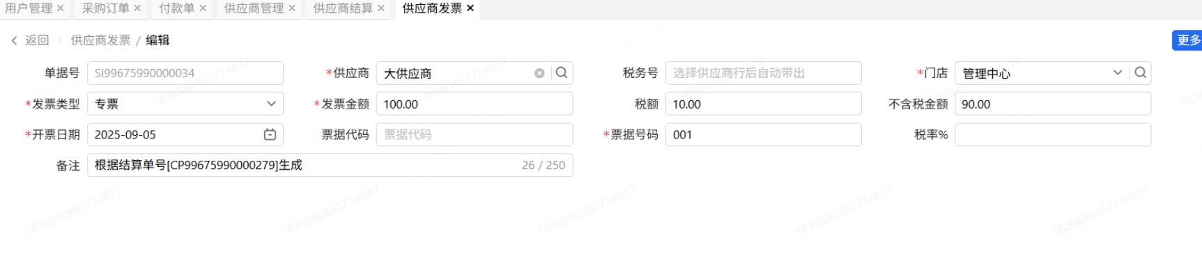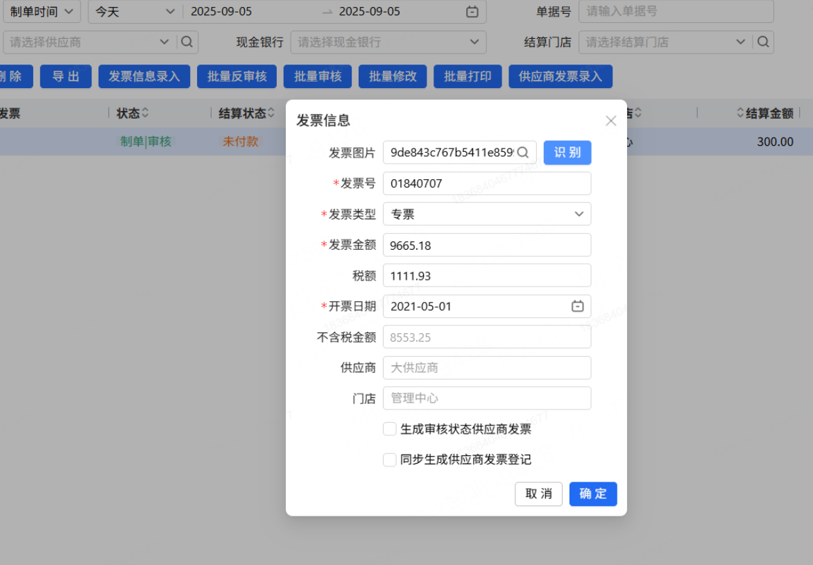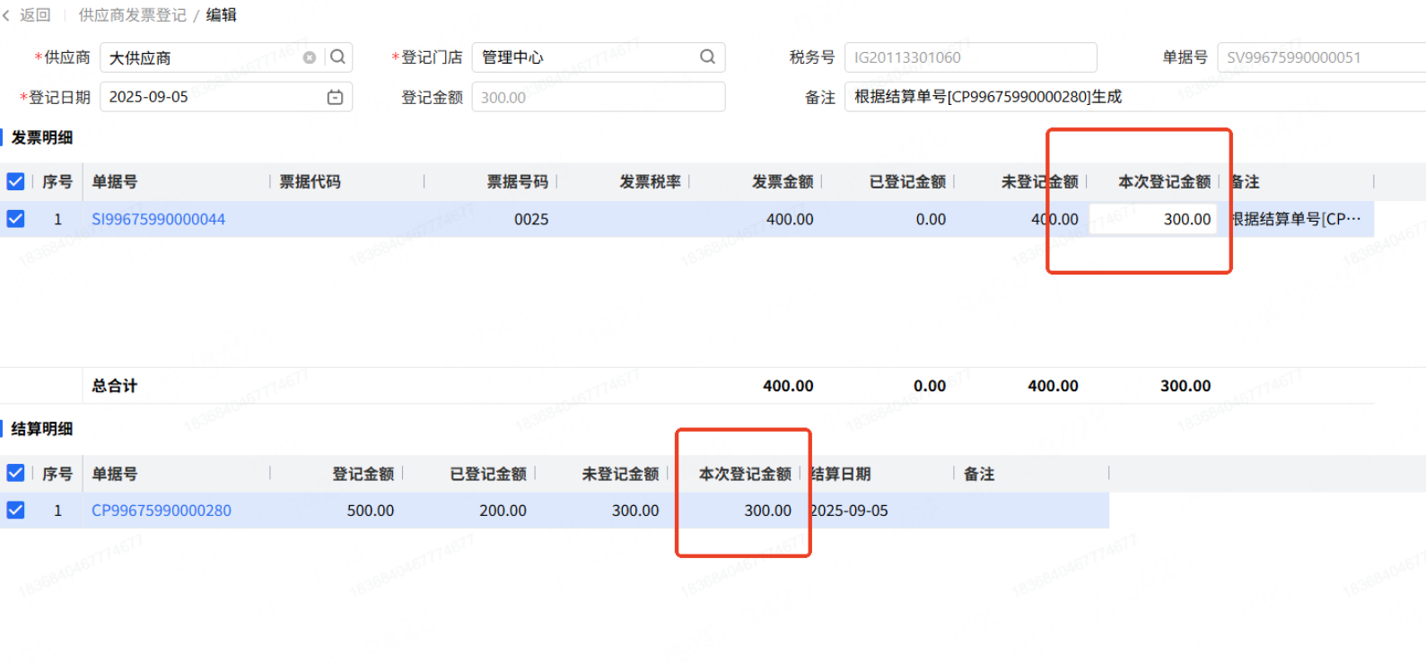 勾选:同步生成供应商发票登记,状态=制单,生成的供应商发票登记数据如下