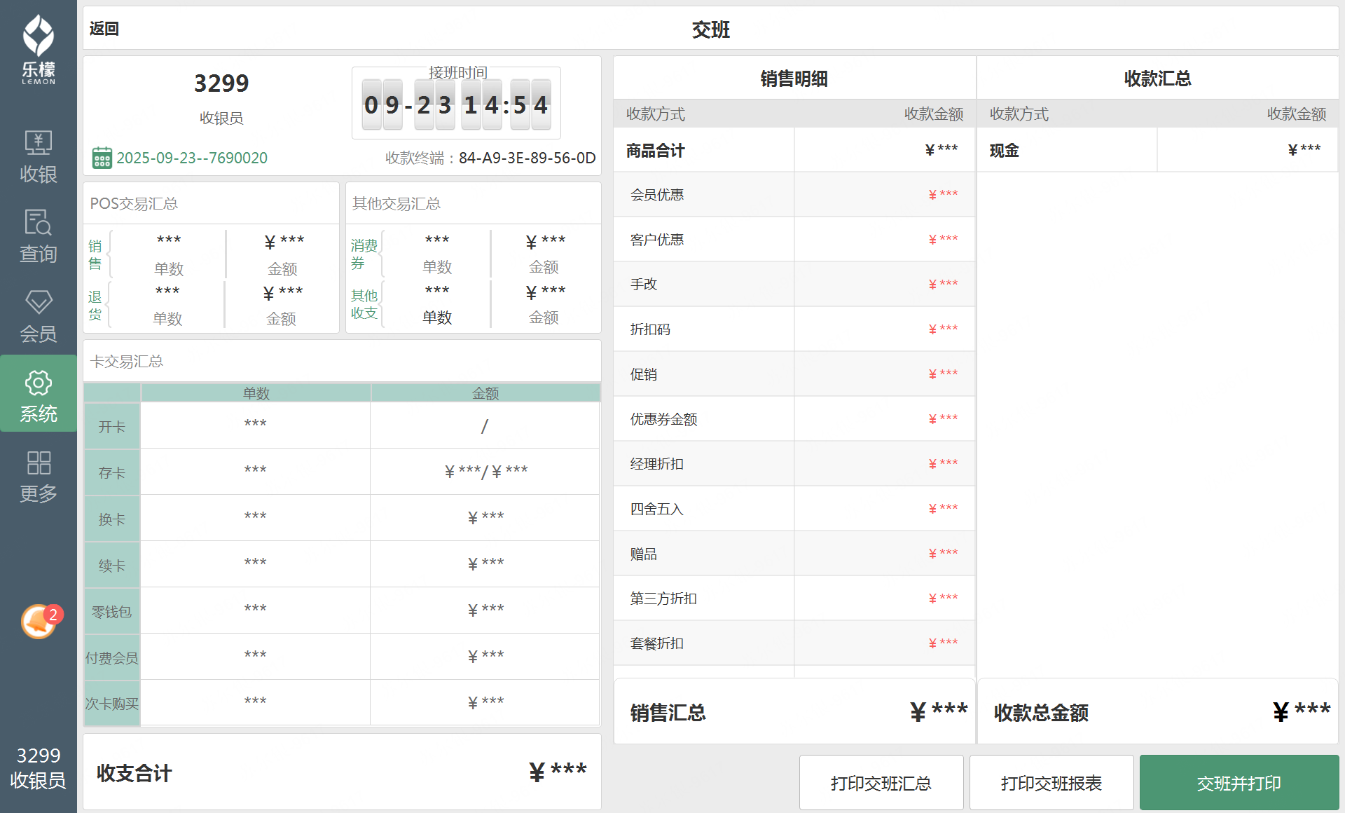 支付类型查询 | 未勾选的情况下,打印出来的交班上仅显示现金金额,其他支付方式显示为*** |