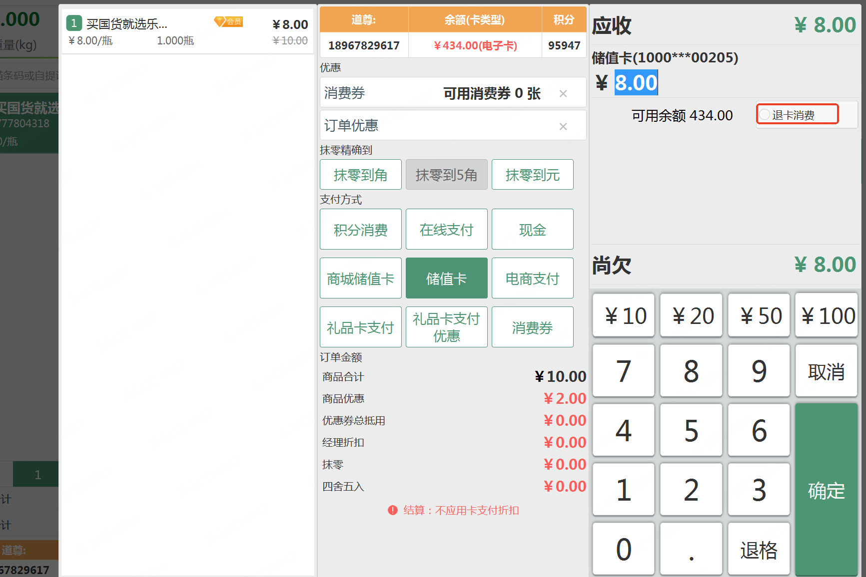消费卡消费 | 未勾选的情况下,不允许在前台使用会员卡结算 |