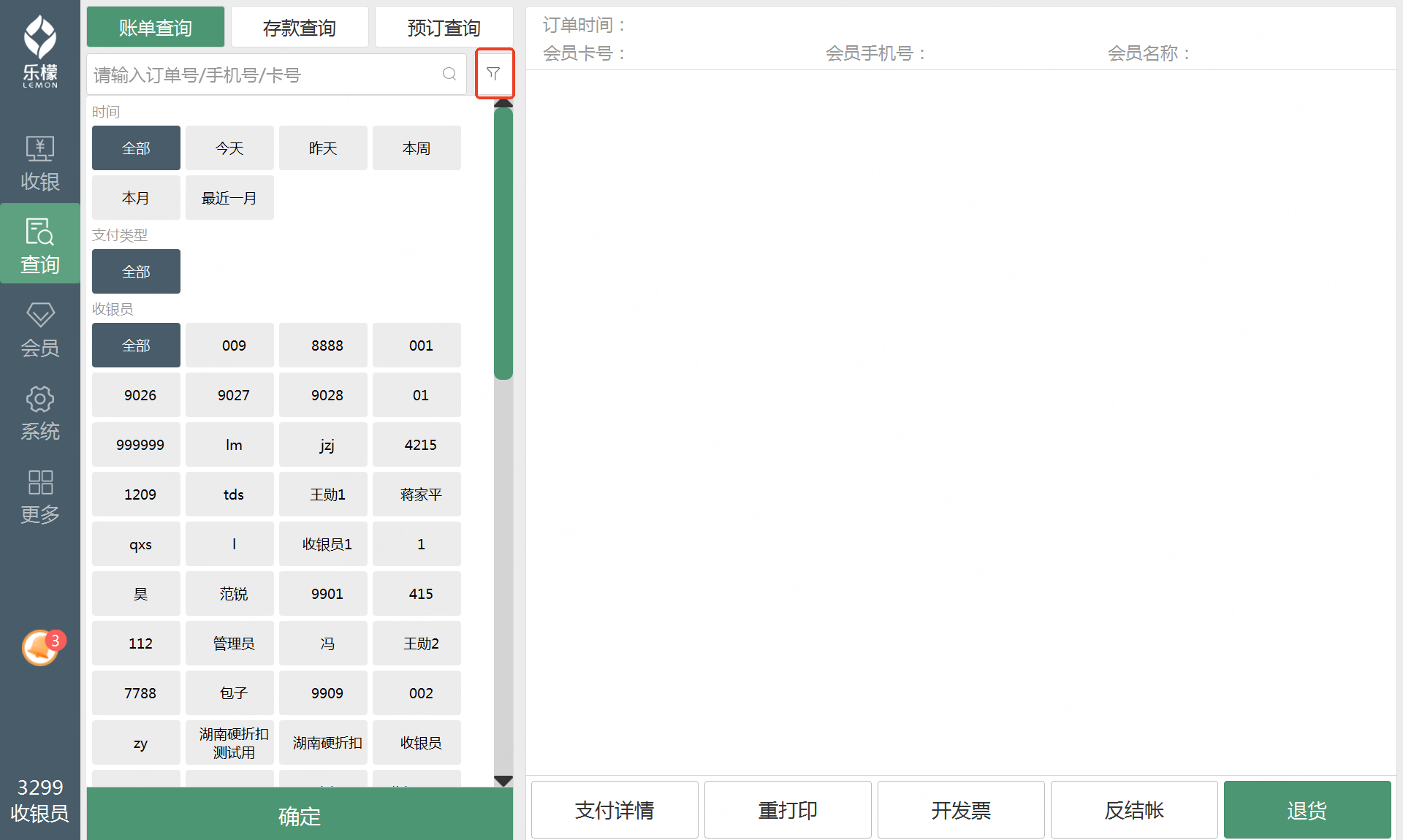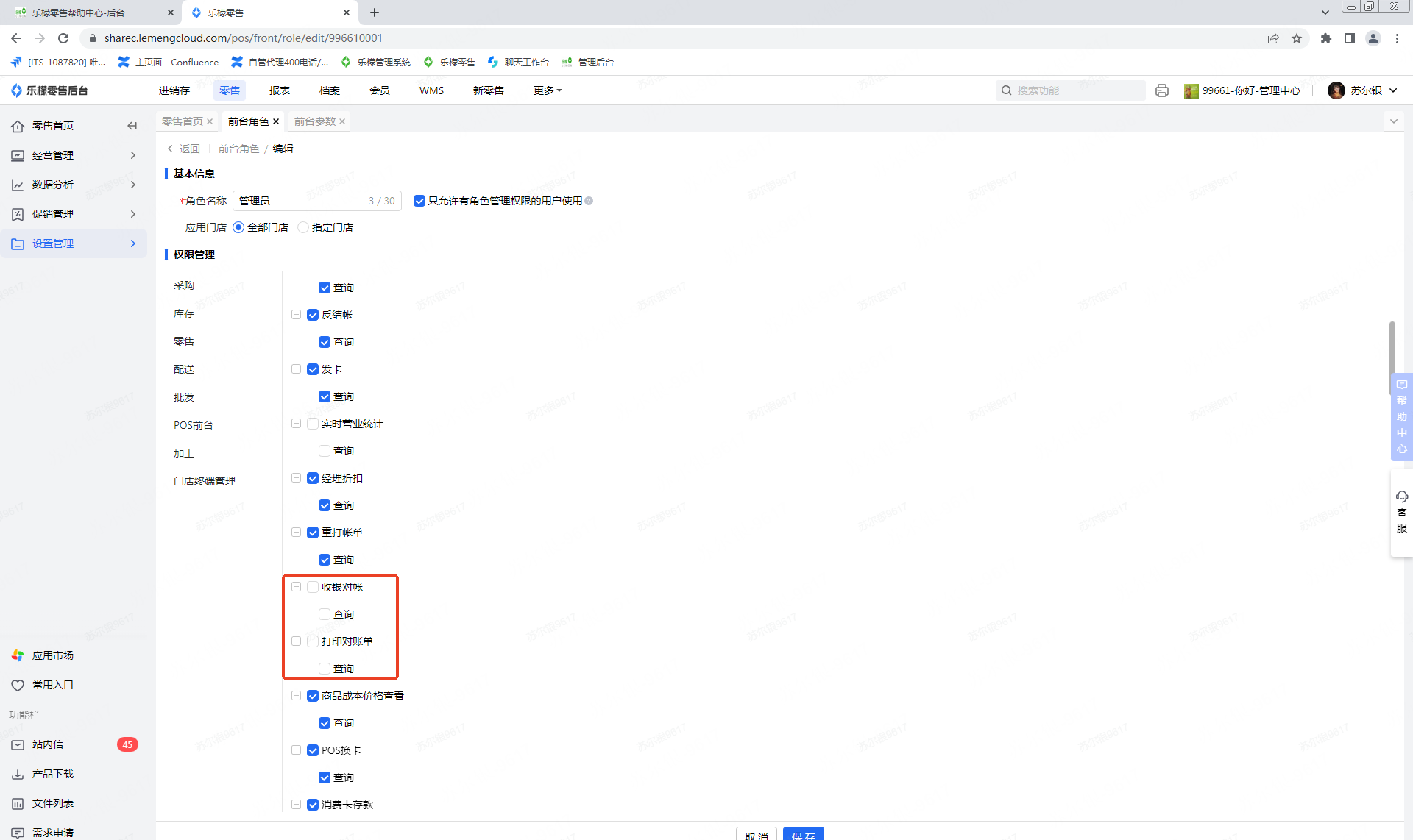1.POS前台,不勾选收银对账权限、打印对账单权限