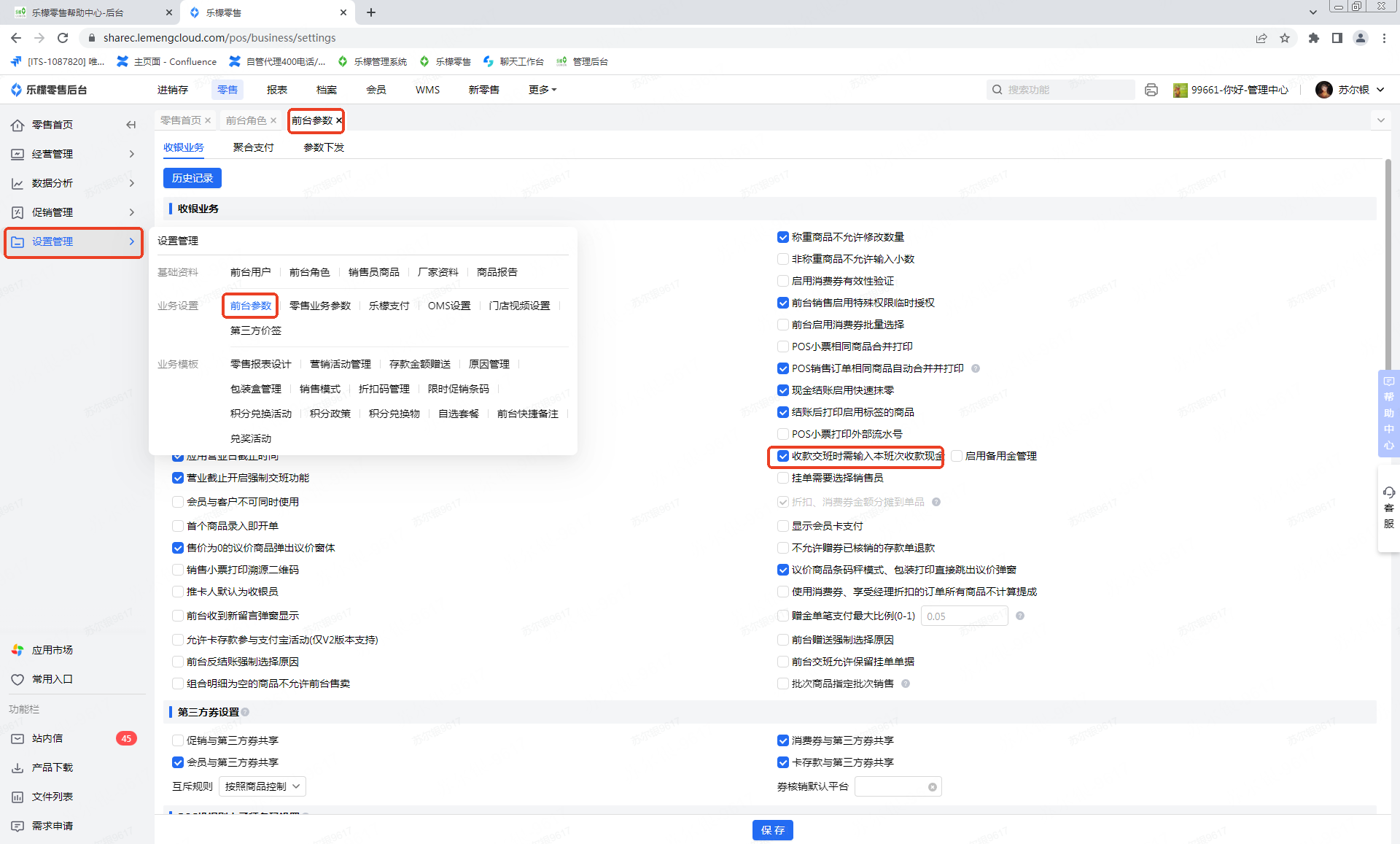 2.前台参数中开启参数【收款交班时需输入本班次收款现金】